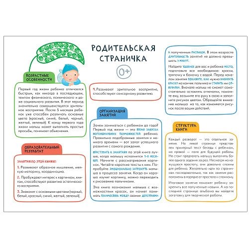 Книга «Рисуем красками 0+» из серии «Школа Семи Гномов. Мастерская» — это альбом для занятий рисованием с ребенком от рождения до года. Занятия на близкие и понятные ребенку темы расположены по мере усложнения: поступательно переходя от освоения простых навыков к более сложным заданиям, ребенок научится рисовать с помощью пальчиков и создавать красочные рисунки.