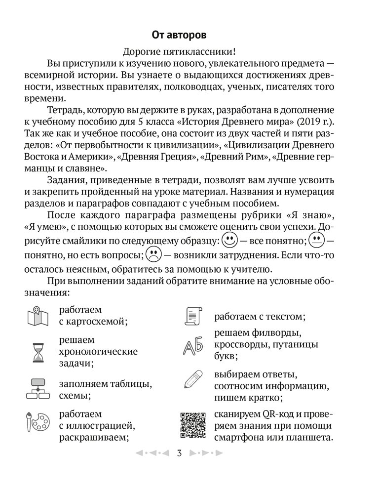 Тетрадь составлена в соответствии с учебной программой. К каждому параграфу учебного пособия по истории Древнего мира в издании приведены разнообразные компетентностно-ориентированные задания, предусматривающие работу с картосхемами, историческими документами и художественными текстами, иллюстрациями, таблицами, кроссвордами, ребусами, филвордами, «облаками слов» и т. д. К урокам обобщения предложены интерактивные упражнения. Учащиеся смогут оценить себя с помощью рубрик «Я знаю» и «Я умею», размещенных после всех заданий параграфа.