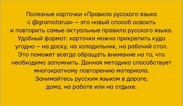 Переживаете, не растеряли ли вы грамотность в гонке сетевого общения? Запутались в значении похожих слов? Не уверены, писать слитно или раздельно? Спасение есть! Эти карточки-шпаргалки от создателя известного инстаграм-блога "Твоя грамотность" @gramotarus напомнят о самых актуальных правилах русского языка, которые представлены просто, занимательно и ярко.
