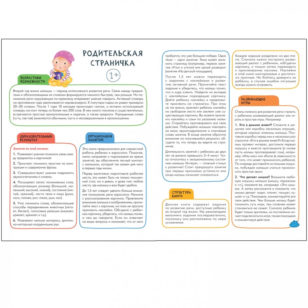 Книга «Развитие речи 1+» из серии «Школа Семи Гномов. Активити с наклейками» предназначена для развития речи и формирования словарного запаса у детей от 1 года до 2 лет.