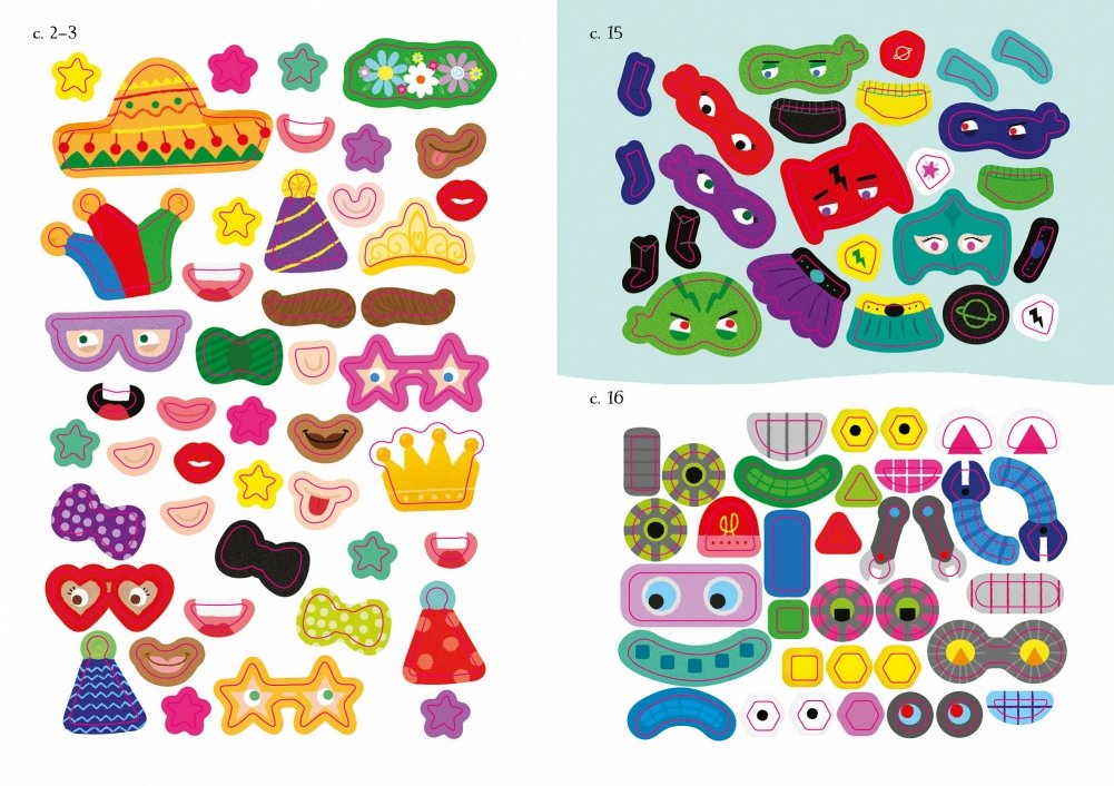 В этой весёлой книжке ты найдёшь забавных животных, команду пиратов, супергероев, роботов, инопланетян и множество других интересных персонажей. Как они будут выглядеть – решать тебе. Используй красочные наклейки для создания образов!