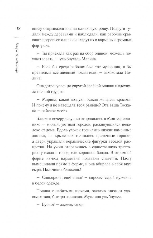 Атмосфера Тосканы не оставляет равнодушными ни застёгнутых на все пуговицы карьеристок, ни художниц с тонкой душевной организацией, которые верят в силу Венеры и Луны и вознамерились во что бы то ни стало выйти замуж за страстного итальянца. Новая история, произошедшая в Тоскане, на раз-два захватывает своим сюжетом, увлекает водоворотом событий, которые закручиваются вокруг главной героини Полины. Успеет ли она "прошмыгнуть" в закрывающиеся Ворота Золушки? Встретит ли своего принца или навсегда разочаруется в итальянских "маменькиных сынках"? Самые неожиданные повороты судьбы одного московского астролога в новом романе от Лидии Давыдовой "Замуж за итальянца".