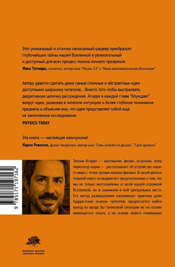 Энтони Агирре — математик, физик, астроном, популяризатор науки — рассказывает об устройстве нашего мира с точки зрения именно физика. В своей увлекательной книге он выдвигает предположение о том, что мы не только неотъемлемы от всей нашей огромной Вселенной, но и занимаем в ней центральное место. Его метод размышления напоминает практику дзен-буддистских коанов: читателю предлагается найти выход из вроде бы тупиковой ситуации не на основе имеющегося опыта, а на основе нового понимания.