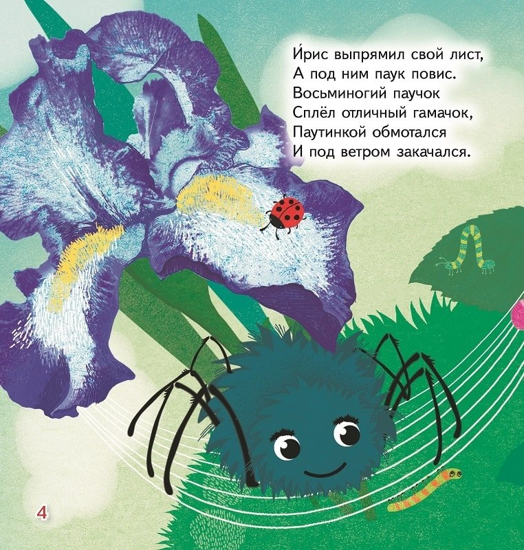 Замечательные иллюстрации Анны Полетаевой вдохновляют наблюдать за природой. Дети запоминают, как выглядят ирисы, нарциссы, колокольчики и другие цветы. С радостью узнают насекомых, с которыми уже встречались: бабочек, шмелей, пчел, и открывают для себя новых, например королеву муравьев или жука-пожарника. Приятное дополнение к книге – вкладыш с наклейками. С их помощью малыш тренирует мелкую моторику рук, внимание и глазомер.
