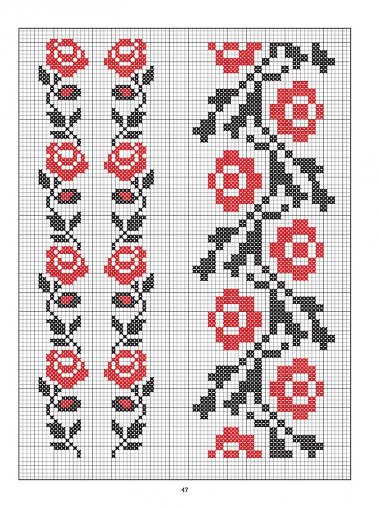 Мотивы были собраны из дореволюционных альбомов с вышивальными узорами и заботливо отреставрированы с применением современных технологий, чтобы облегчить работу рукодельницам. В книгу включены как совсем небольшие мотивы, так и крупные изображения; не только однотонные и двуцветные, но и многоцветные схемы, в которых каждый цвет имеет символическое значение.