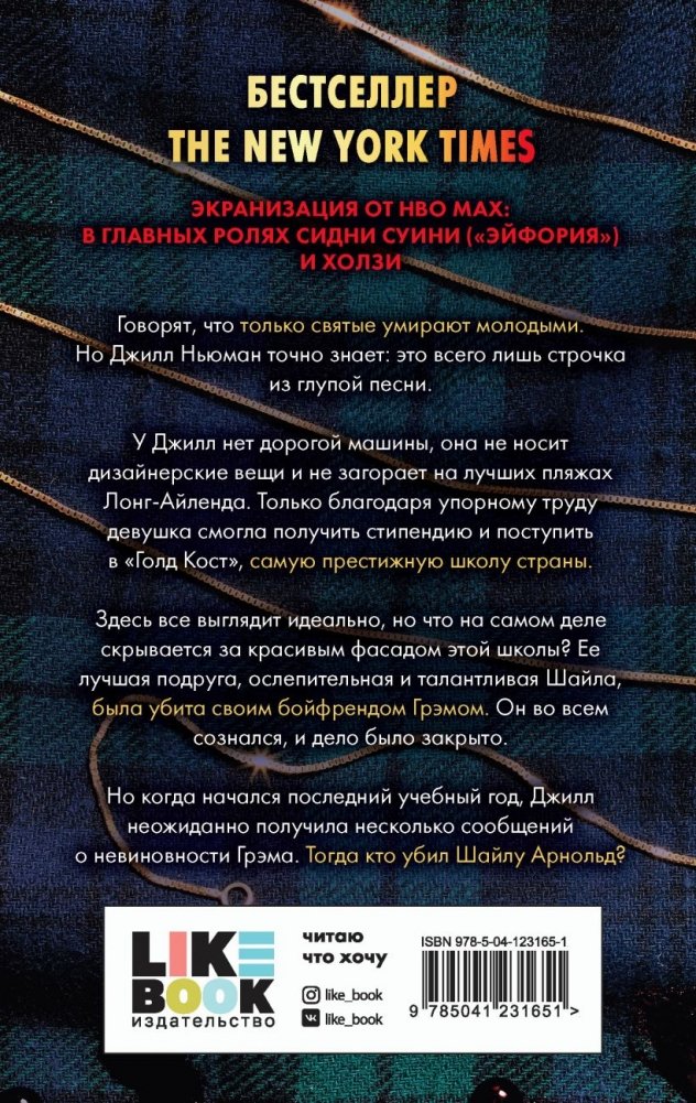Говорят, что только святые умирают молодыми. Но Джилл Ньюман точно знает: это всего лишь строчка из глупой песни. У Джилл нет дорогой машины, она не носит дизайнерские вещи и не загорает на лучших пляжах Лонг-Айленда. Только благодаря упорному труду девушка смогла получить стипендию и поступить в "Голд Кост", самую престижную школу страны. Здесь все выглядит идеально, но что на самом деле скрывается за красивым фасадом этой школы? Ее лучшая подруга, ослепительная и талантливая Шайла, была убита своим бойфрендом Грэмом. Он во всем сознался, и дело было закрыто. Но когда начался последний учебный год, Джилл неожиданно получила несколько сообщений о невиновности Грэма. Тогда кто убил Шайлу Арнольд?