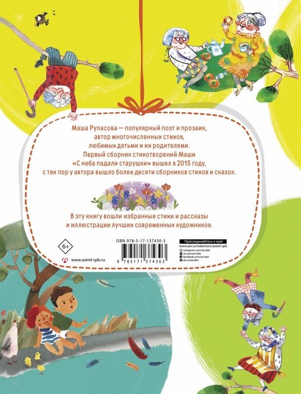 Маша Рупасова — популярный поэт и прозаик, автор многочисленных стихов, любимых детьми и их родителями. Первый сборник стихотворений Маши «С неба падали старушки» вышел в 2015 году, с тех пор у автора вышло более десяти сборников стихов и сказок.