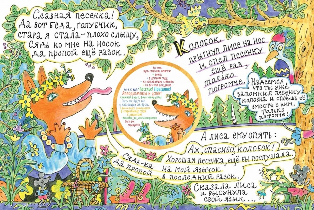 Веселитесь, экспериментируйте! Колобок-то у нас шутник, хитрюля (до поры до времени). Поёт и передразнивает тех, с кем он встречается: зайца, волка, медведя и даже лису. Чтобы сыграть главную роль нужно хорошенько постараться - запомнить текст песенки, чётко и громко выговаривать слова, играть лицом и голосом, изображая разные эмоции.