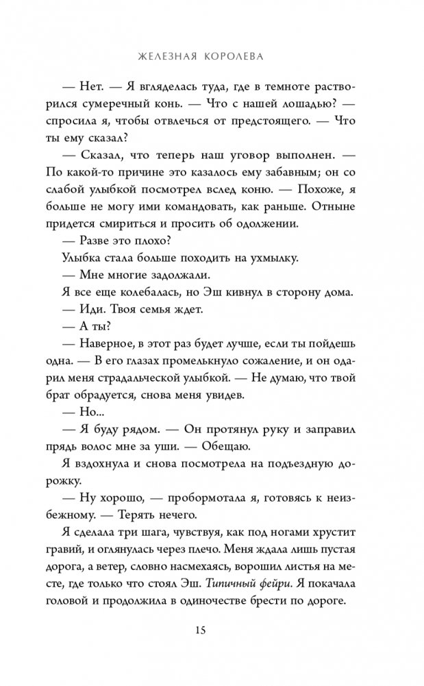 Меня зовут МЕГАН ЧЕЙЗ. Через день мне исполнится семнадцать. За время, что я провела в Фейриленде, я поняла многое. Что за любовь надо бороться до конца, но рано или поздно ее придется принести в жертву. Что ты один против целого мира и нет простых решений. Что необходимо различать, когда идти вперед, а когда отступить. Я ДУМАЛА, ЧТО ВСЕ ЗАКОНЧИЛОСЬ. НО ФИНАЛЬНАЯ БИТВА ВПЕРЕДИ… Меган пришлось вернуться в мир смертных и пойти на все ради тех, кого она любила. Но расслабляться рано: новый Железный король собирает армию, чтобы выступить против Летнего и Зимнего двора и уничтожить Небыль. Вековое соперничество должно быть раз и навсегда забыто — новый враг требует объединения сил. Меган придется вспомнить, кто она и чья кровь течет в ее жилах. Кто знает, может, так девушка обретет свое новое предназначение! Если только не погибнет в этой отчаянной войне… Третья часть одного из лучших циклов про фейри! О злых, коварных созданиях и девушке, вынужденной играть по их правилам. Меган после изгнания вновь возвращается в Фейриленд, чтобы осуществить условия сделки и уничтожить железного Лжекороля. Летним и Зимним фейри придется забыть о разногласиях, вся Небыль под угрозой исчезновения! Кагава проработала мир до мелочей: Небыль разделена на три царства. Аркадия — Летний двор, Тир-на-ног — Зимний двор и Железное королевство. Последним правит железный фейри — ужас технологического прогресса, который нереально уничтожить. Не забывайте: войны между фейри, а также обмен Скипетром времен года, влияют на погоду и эмоциональный климат всего человечества. А уж какую сильную и коварную любовь вы встретите в Фейриленде! Меган не могла поверить, что ее возлюбленный Эш так жестоко обошелся с ней. Но теперь он другой: прямолинеен, нежен и учтив. Надолго ли? «Я могу прочитать эту книгу тысячу раз и никогда не устану от нее. Это одна из моих самых любимых книг во всей серии. Магическая сказка, наполненная непредсказуемостью, решимостью, судьбоносностью, любовью и потерями». — Amazon.com Риск, мощный экшен, подковерные игры, любовь, страсть, жестокость, ответственность за собственные решения, месть, кровь, самопожертвование — в этой серии все, что составляет основу эпичного фэнтези. Серия выходит в оригинальных обложках с закрашенными обрезами!