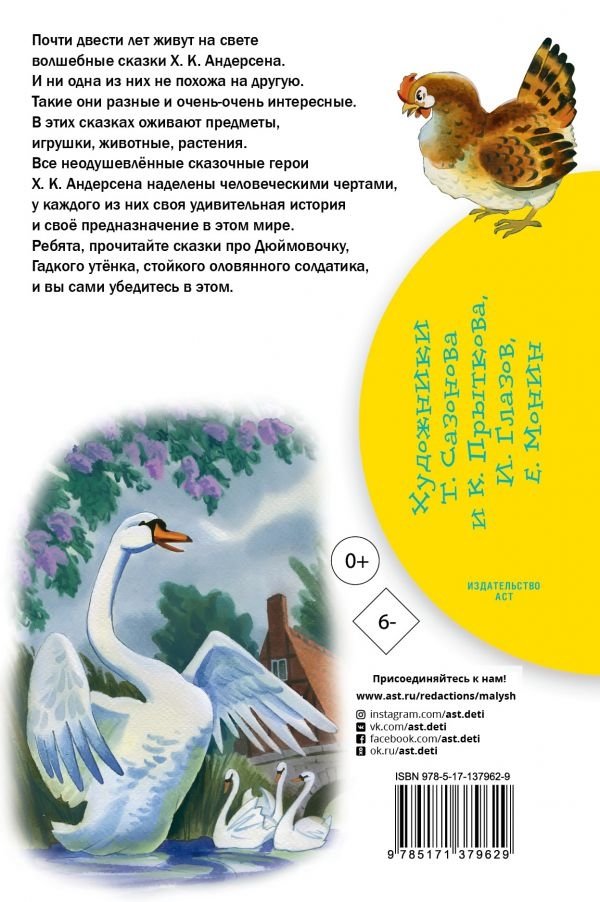 Ханс Кристиан Андерсен (1805—1870) — один из самых выдающихся мировых писателей-сказочников. Открывая детям волшебный мир сказки, писатель знакомит маленького читателя с огромным окружающим миром, дает ему первые уроки мудрости и доброты. В нашей книге самые известные сказки великого датского автора: "Дюймовочка", "Гадкий утёнок" и "Стойкий оловянный солдатик".