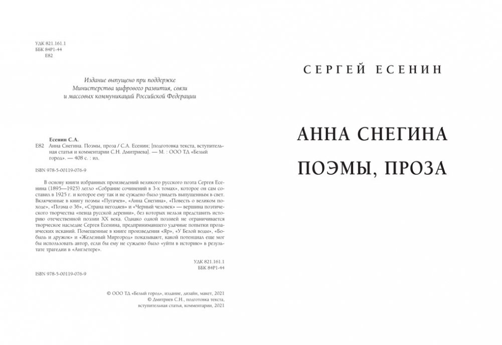 В основу книги избранных произведений великого русского поэта Сергея Есенина (1895-1925) легло "Собрание сочинений в 3-х томах", которое он сам составил в 1925 г. и которое ему так и не суждено было увидеть выпущенным в свет. Включенные в книгу поэмы "Пугачев", "Анна Снегина", "Повесть о великом походе", "Поэма о 36", "Страна негодяев" и "Черный человек" - вершина поэтического творчества "певца русской деревни", без которых нельзя представить историю отечественной поэзии XX века. Однако одной поэзией не ограничивается творческое наследие Сергея Есенина, предпринимавшего удачные попытки прозаических исканий. Помещенные в книге произведения "Яр", "У Белой воды", "Бобыль и дружок" и "Железный Миргород" показывают, какой потенциал еще мог бы использовать автор, если бы ему не суждено было "уйти в историю" в результате трагедии в "Англетере".