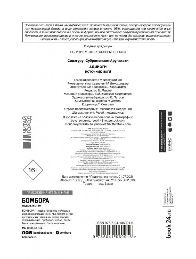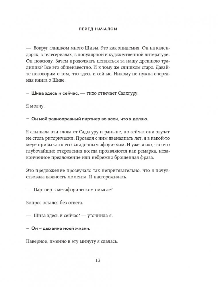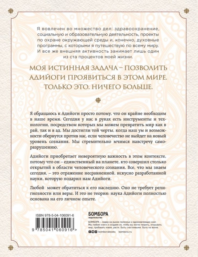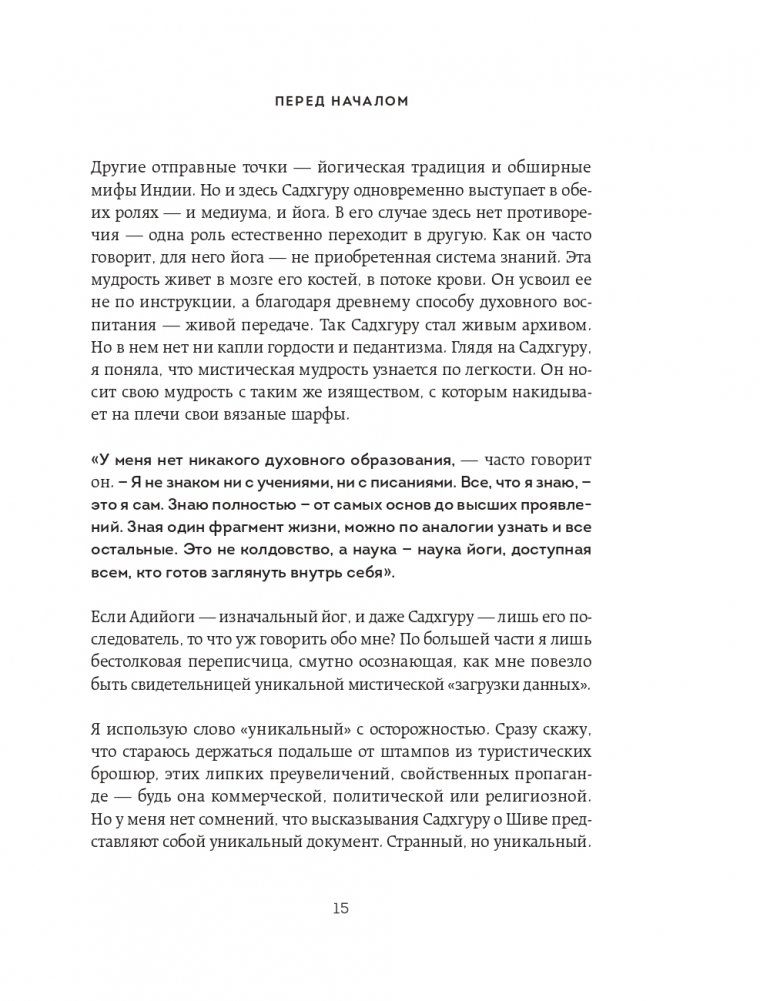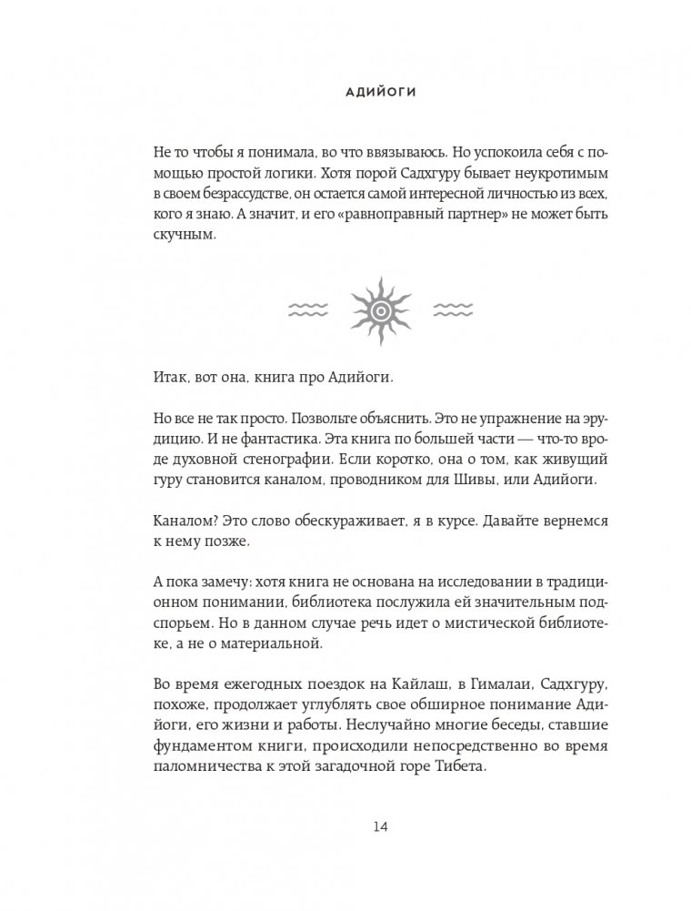 Книга посвящена Адийоги – первому в мире йогу. Он разработал искусную, обширную систему самопознания человека, способную привести любого к освобождению от психологических и физических ограничений. И, хотя Адийоги ходил по Земле 15 тысяч лет назад, его наследие до сих пор питает сущностные духовные учения на планете. Книга состоит из трех частей. Первая и вторая части написаны от лица Садхгуру. Здесь рассказывается о появлении Адийоги в нашем мире и его непревзойденной работе в области самопознания человека. Садхгуру ведет повествование, сплетая йогическую историю с древними сказаниями и мифами о Шиве, а также обращаясь к современности и новейшим научным исследованиям. Третья часть книги представляет собой диалоги Садхгуру с его ученицей Арундхати Субраманиам, соавтором книги. Во время их совместного паломничества к священной горе Кайлаш Садхгуру отвечает на ее вопросы, связанные как с Адийоги, так и с темами, близкими любому человеку. Садхгуру – йог, мистик, основатель некоммерческой благотворительной организации Isha. Успешно выступает с лекциями в самых авторитетных учреждениях мира, включая ООН, Google, Оксфорд и другие. В 2018 году, по приглашению Сбербанка, выступил на Петербургском международном экономическом форуме. В Индии входит в топ-50 наиболее влиятельных людей.