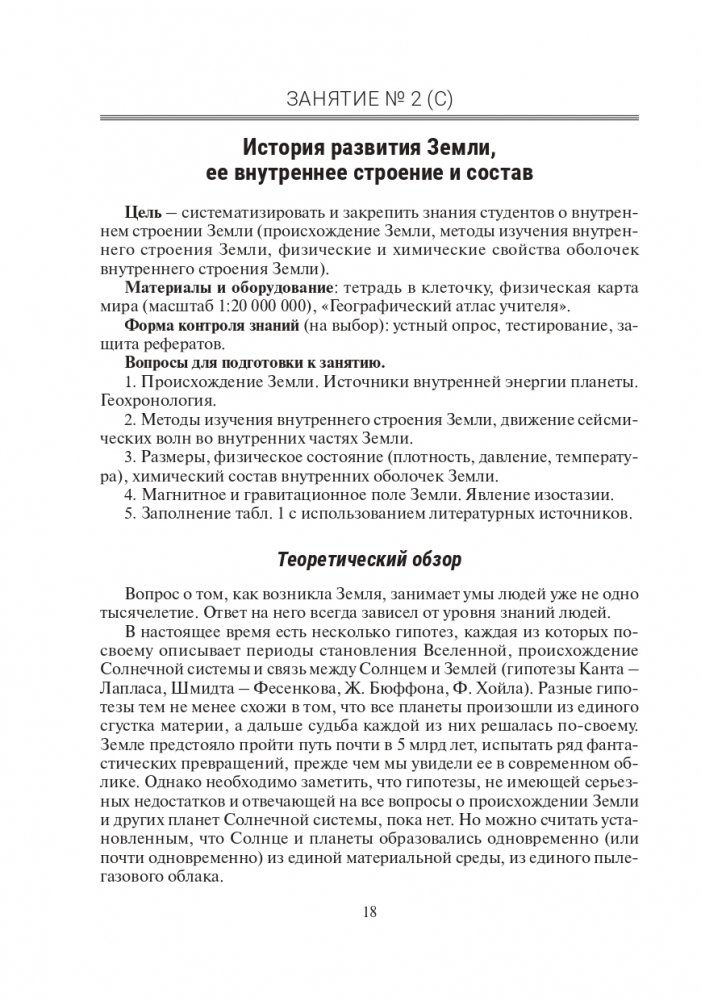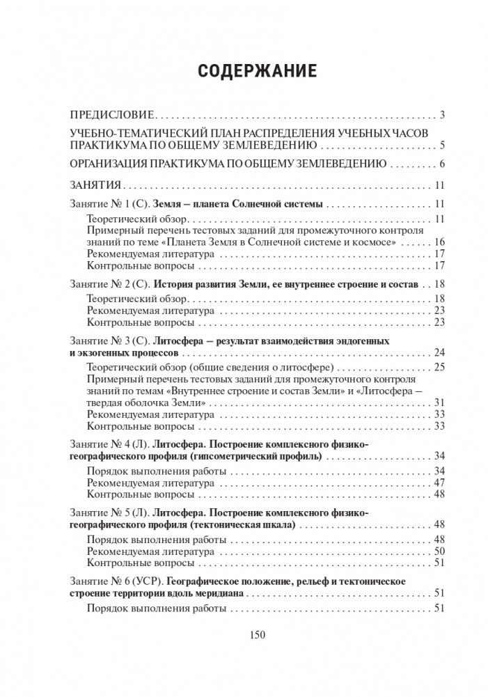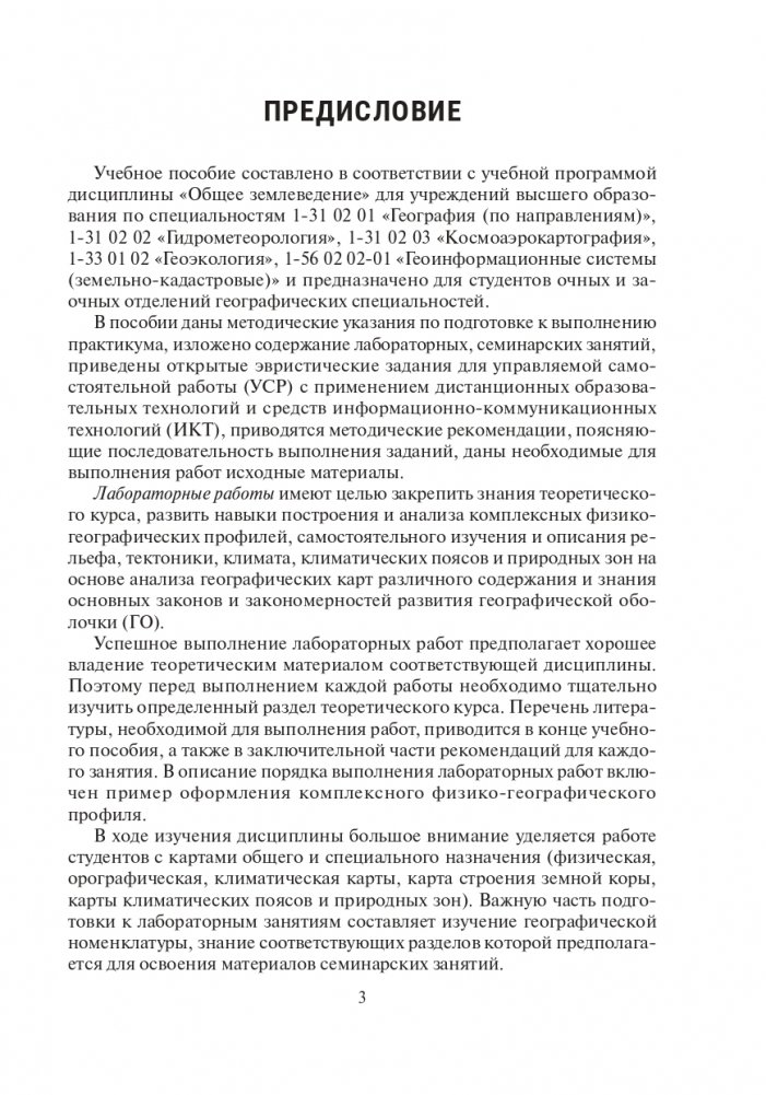Представлены практические занятия по темам, предусмотренным учебной программой дисциплины «Общее землеведение». Включает задания для проведения лабораторных работ, перечень вопросов и заданий для семинарских занятий, открытые эвристические задания для управляемой самостоятельной работы студентов, минимум географической номенклатуры, примерный перечень заданий в тестовой форме для итогового и промежуточного контроля знаний. Для каждого задания указаны исходные материалы, описан порядок выполнения и приводятся методические рекомендации по выполнению и оформлению работы. В конце пособия приводится перечень учебно-методической литературы, научных изданий, атласов, необходимых для успешного выполнения заданий.