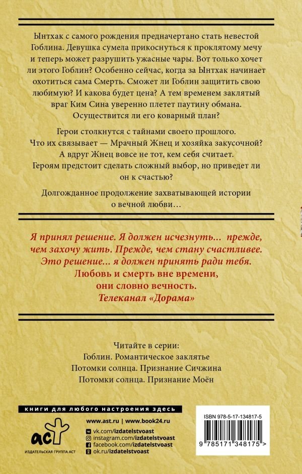 Ынтхак с самого рождения предначертано стать невестой Гоблина. Девушка сумела прикоснуться к проклятому мечу и теперь может разрушить ужасные чары. Вот только хочет ли этого Гоблин? Особенно сейчас, когда за Ынтхак начинает охотиться сама Смерть. Сможет ли Гоблин защитить свою любимую? И какова будет цена? А тем временем заклятый враг Ким Сина уверенно плетет паутину обмана. Осуществится ли его коварный план? Герои столкнутся с тайнами своего прошлого. Что их связывает — Мрачный Жнец и хозяйка закусочной? А вдруг Жнец вовсе не тот, кем себя считает? Героям предстоит сделать сложный выбор, но приведет ли он к счастью? Долгожданное продолжение захватывающей истории о вечной любви...
