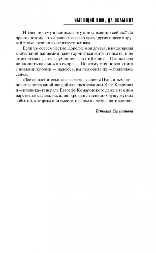 1826 год. Англичанка Клер Клермонт, бывшая гражданская жена лорда Байрона, живет в имении подруги, русской барыни Юлии Посниковой, в качестве гувернантки ее детей. Однажды, когда она гуляет у пруда, на нее нападает неизвестный. Клер спасает проезжавший мимо граф Евграф Комаровский, бравый генерал, командир корпуса внутренней стражи, бывший личный телохранитель царя. Влюбившись в английскую красавицу с первого взгляда, Комаровский задерживается в имении Посниковой и начинает расследовать нападение на Клер... Татьяна Степанова – подполковник полиции, бывший сотрудник пресс-центра ГУВД Московской области и следователь, поэтому ее истории так правдоподобно и детально описывают расследования криминальных загадок.
