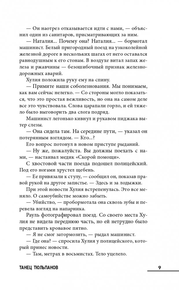 Невероятно нежный и в то же время жестокий триллер «Танец тюльпанов» получил множество восторженных отзывов на иностранных платформах и вошел в список бестселлеров Amazon в 2019 году. Алый тюльпан стал символом смерти. Это захватывающее путешествие по уютному региону Испании, на первый взгляд тихому и умиротворенному. Но все меняется после убийства популярной журналистки, которое транслировалось в прямом эфире через Фэйсбук. Она стала первой жертвой в руках с алым, как кровь, тюльпаном, но не последней. Мирное время сменилось бушующим страхом. Полиции придется «заглянуть» в прошлое, разгадать мотивы и найти знаменитого Убийцу с тюльпаном. «Ибон Мартин создал жестокий и нежный триллер, подобный тюльпанам, которыми убийца украшает своих жертв… Превосходный роман». – Доминго Вильяр «Танец тюльпанов» - головокружительное криминальное путешествие, это напряженное время, в течение которого мы узнаем об окружающей среде и психологии человека. С яркими конкретными моментами, такими как прогулка по рынку или разговоры в баре, среди бесчисленного множества других: серфинг, монастырь, музыкальное представление, семейная конфронтация ... и это не значит, что эти места существуют для того, чтобы что-то происходило – что-то происходит, потому что эти места просто существуют [...] Портреты персонажей и обстановка находятся в гармонии так, чтобы ничего не резало глаз и читатель мог полностью погрузиться в историю, забывая, что впереди грандиозный финал. Это замечательно». – Хорди Валеро, Interrobang