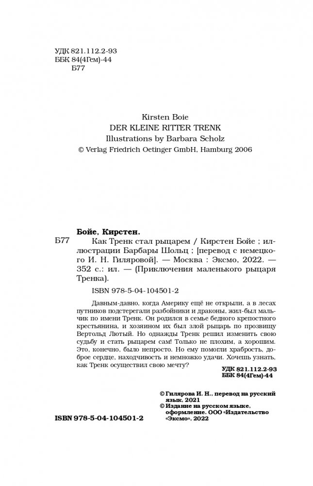 Давным-давно, когда Америку ещё не открыли, а в лесах путников подстерегали разбойники и драконы, жил-был мальчик по имени Тренк. Он родился в семье бедного крепостного крестьянина, и хозяином их был злой рыцарь по прозвищу Вертольд Лютый. Но однажды Тренк решил изменить свою судьбу — и стать рыцарем сам! Только не плохим, а хорошим. Это, конечно, было непросто. Но ему помогли храбрость, доброе сердце, находчивость и немножко удачи. Хочешь узнать, как Тренк осуществил свою мечту? Автор этой книги Кирстен Бойе — всемирно известная немецкая писательница, классик современной детской литературы. Её книги удостоены множества наград (в том числе, премии ЮНЕСКО и Немецкой молодёжной литературной премии) и переведены на множество языков. По ним снимают фильмы и мультсериалы. Издание отличает удобный для чтения шрифт — и множество обаятельных чёрно-белых иллюстраций. Отличный вариант как для самостоятельного чтения, так и для чтения всей семьёй! Книга будет интересна мальчикам и девочкам 6—9 лет.