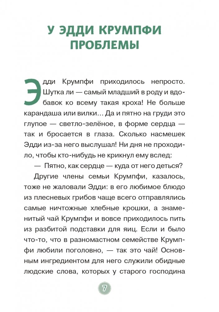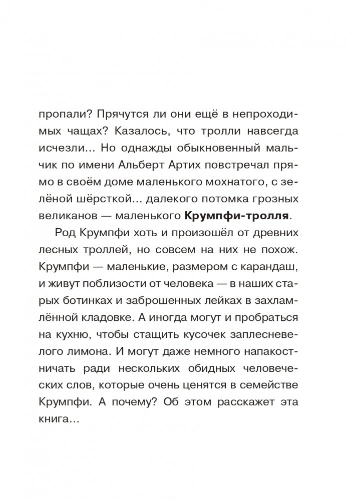 Если вы слышите странные звуки, если всё валится из рук, если вещи оказываются не на своих местах, возможно, в вашем подвале поселилось семейство троллей Крумпфи. Вы любите чай? Тролли его просто обожают. Правда, их чай необычный: он сделан из человеческих обидных слов. Бабушка-тролль тщательно высушивает такие слова, а потом дробит на чаинки. Поэтому тролли радуются, когда кто-то ругается. И если вдруг попадётся доброжелательная семья, они сделают всё, чтобы люди поссорились. И только один маленький тролль с пятнышком в виде сердца не умеет быть злым и вредным. Заваривайте чай, устраивайтесь поудобнее и давайте знакомиться с троллем Эдди и его друзьями. В подвале переполох. Живущие там Крумпфи-тролли узнали, что в дом въезжают новые люди. А значит, будет много ссор и обидных слов. Но не тут-то было — в семье Артихов все очень вежливые. К счастью, тролли умеют рассердить даже самых воспитанных людей. Маленький тролль Эдди вызывается подняться к людям и устроить им неприятности. И у него получается! Только вот теперь Артихи хотят продать дом, а этого никак нельзя допустить. Придумала Крумпфи-троллей Аннет Рёдер, известный немецкий автор. На написание историй о троллях Аннет вдохновили её трое детей. А иллюстратор детских книг Барбара Кортуэс подарила героям выразительную внешность. Серия «Приключения Крумпфи-троллей» состоит из 11 книг, в каждой из которых поднимается серьёзная и актуальная тема: от благополучия в семье до буллинга в школе, при этом подача мягкая, приправленная добрыми шутками. Красочные иллюстрации, удобный формат и крупный шрифт помогут детям младшего школьного возраста полюбить чтение.