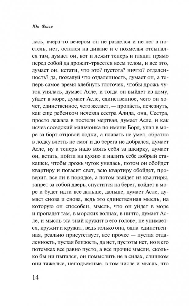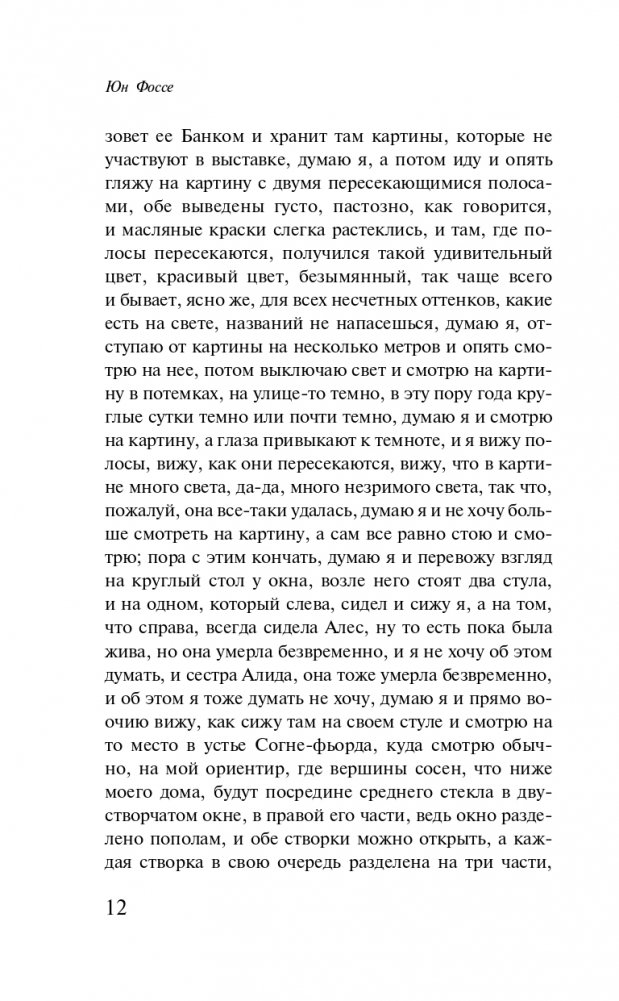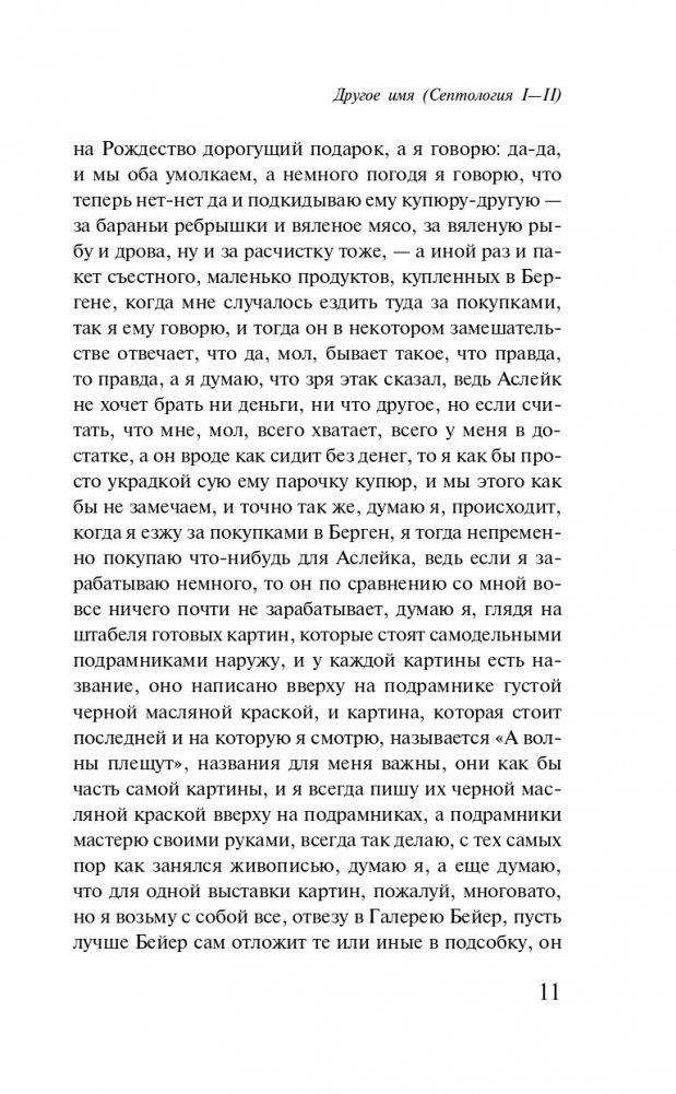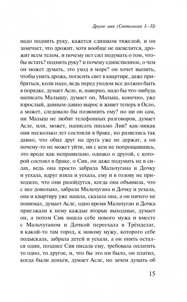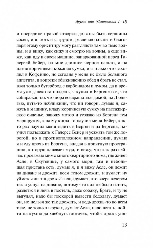 Художник Асле живет в Дюльгью. В основном он общается только со своим соседом, холостым рыбаком Ослейком. В Бьёргвине живет еще один Асле. Он тоже художник. Оба Асле дружат и в каком-то смысле представляют собой две версии одной и той же жизни. В первой книге "Септологии" мастер "медленной прозы" Юн Фоссе ретроспективно знакомит нас с детством обоих Асле. "Другое имя" — это история о памяти, фьорде, опасностях и о соседе, сгинувшем в море.