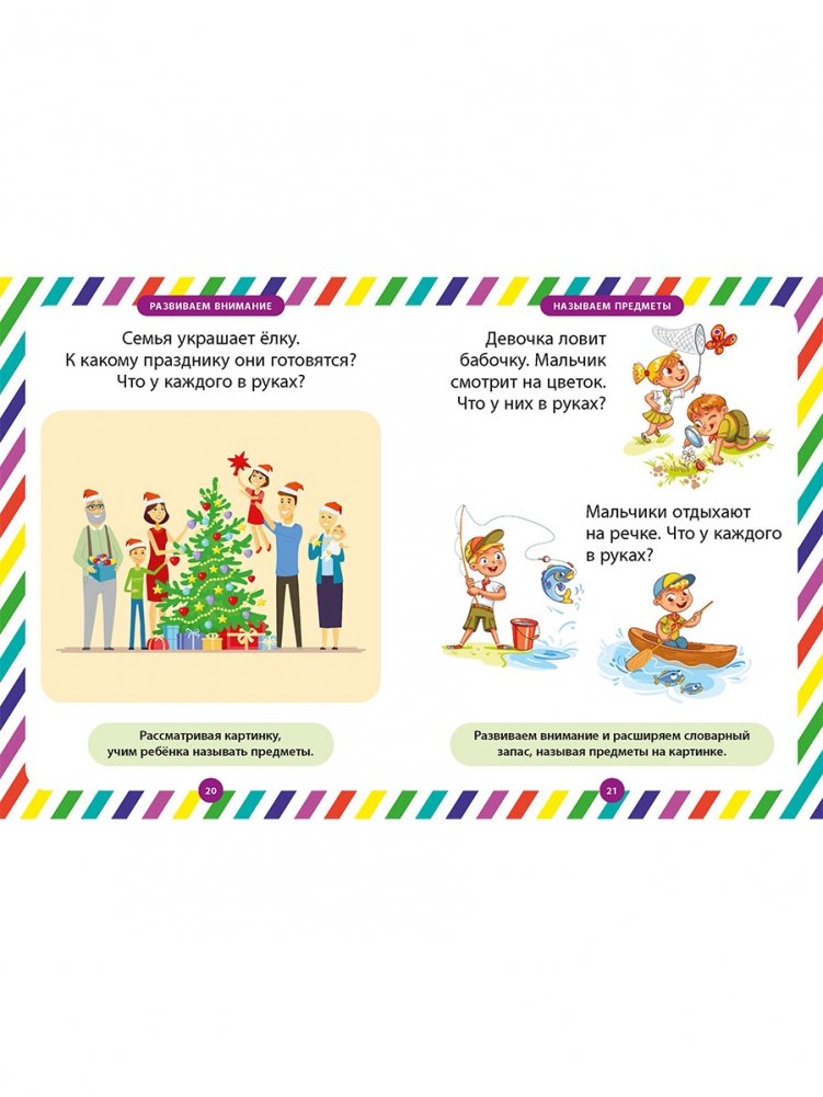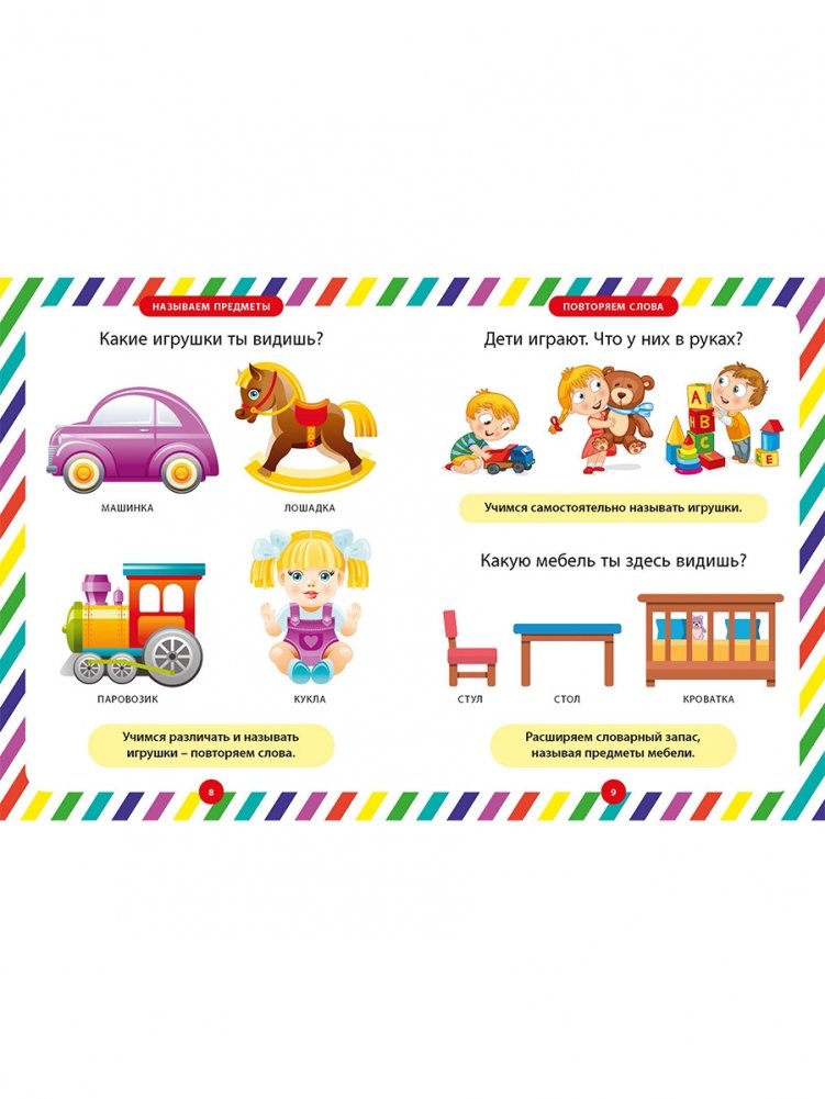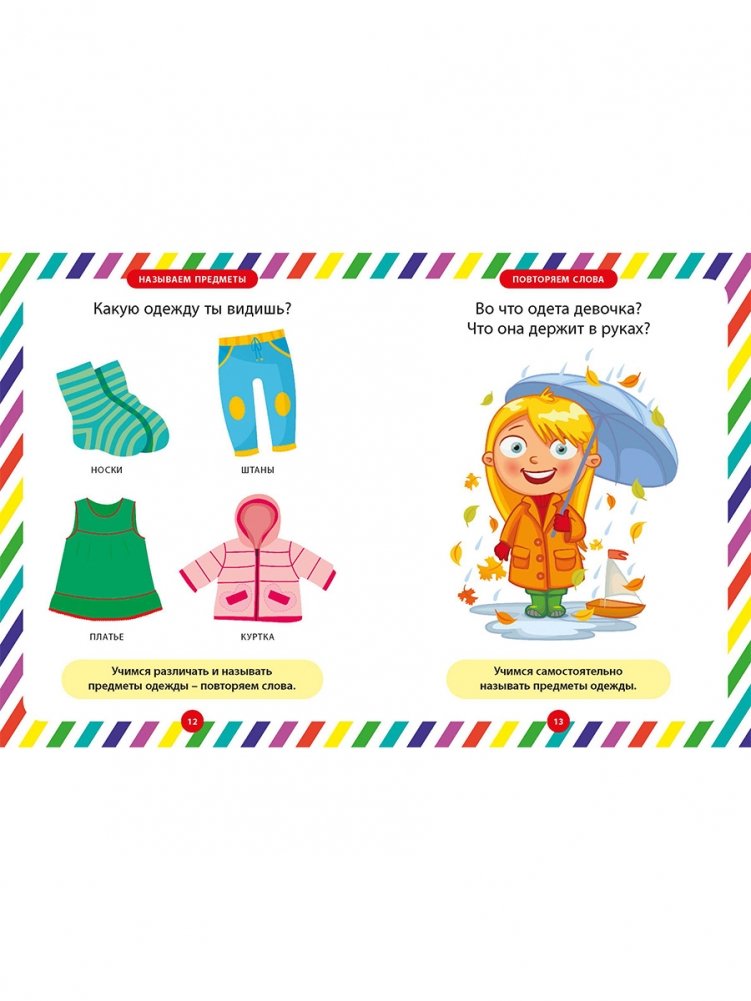Давайте вместе поможем его развитию, начиная с несложных заданий для ребёнка. Рассматривая яркие картинки на страницах этой книжки, он сможет повторять за вами слоги, затем слова и фразы, постепенно научится различать цвета и формы, противоположности, считать от 1 до 5 и многое другое. Занимаясь с малышом по нашей книге, вы научите его вниманию, простой логике, расширите его кругозор. Пусть эта книга станет для вас добрым помощником в занятиях с вашим ребёнком!