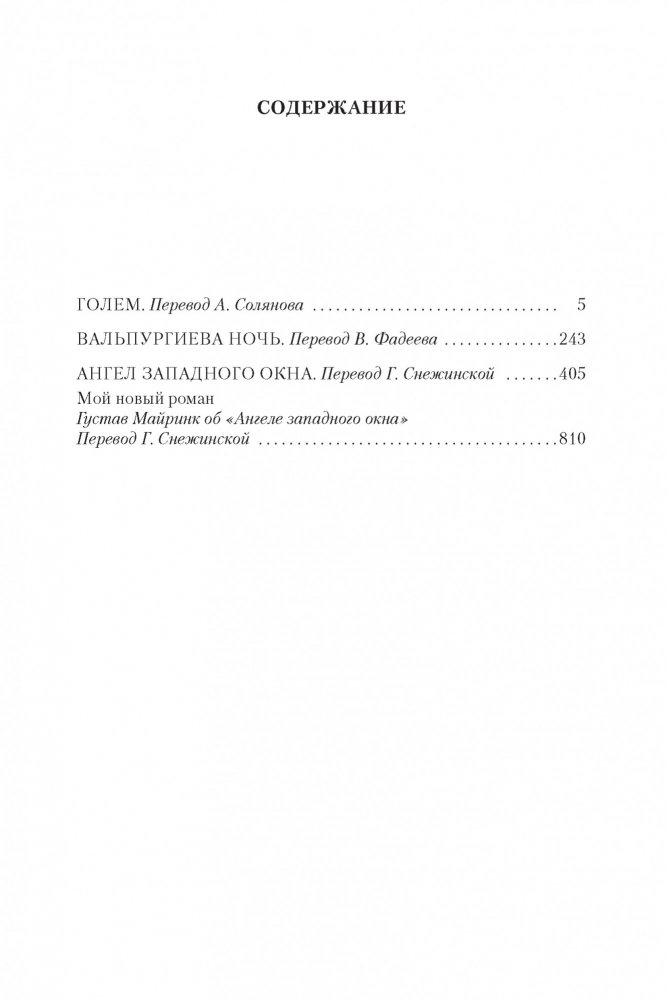 В настоящее издание вошли три самых известных романа мастера мистической прозы: «Голем», «Вальпургиева ночь» и «Ангел западного окна», самое значительное из всех произведений Майринка, задуманное им как итог всего творчества.