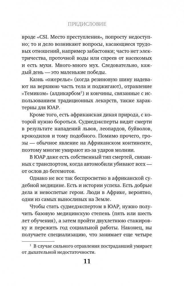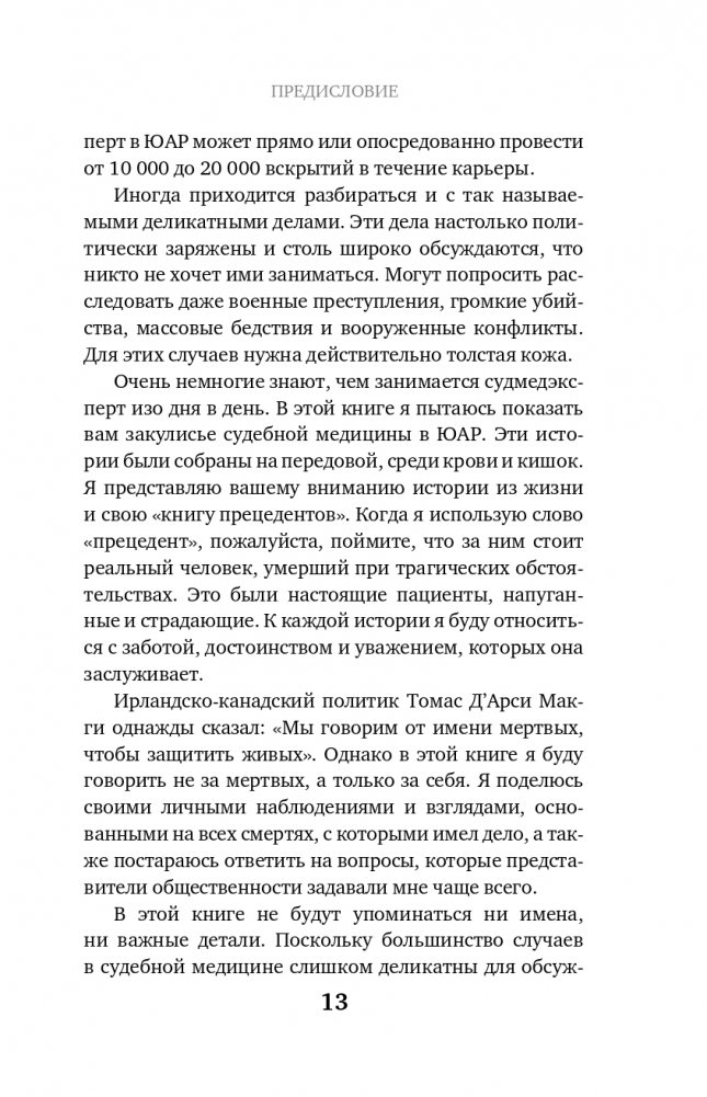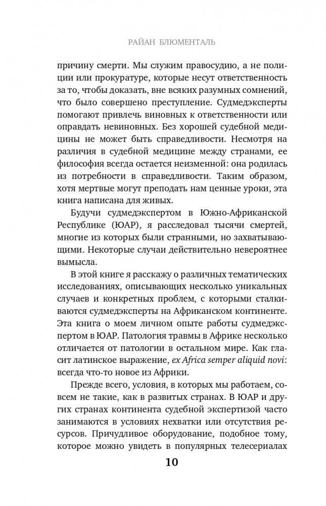 "Патология может смотреть вам прямо в лицо, но если у вас нет опыта или вы не читали об этом раньше, то, вероятно, пропустите улику", - говорит Райан Блюменталь, судмедэксперт из ЮАР. В своей книге он рассказывает, чем судебная медицина в этой части света отличается от практики в других странах, и делится уникальным опытом. Вы узнаете, как порой судмедэксперты работают без воды, электричества и даже средств индивидуальной защиты, какой опасности они подвергаются и что чаще всего становится причиной смерти людей, живущих в ЮАР. Как по телу определяется причина и время смерти, почему всегда все нужно подвергать сомнению, и почему судмедэксперт должен быть подготовлен к осмотру мертвых не только физически, но и психологически. Работая в Африке, Блюменталь исследовал тысячи смертей, странных и невероятных, страшных, спланированных и внезапных, и эта книга стала результатом его размышлений о профессии и особенностях судмедэкспертизы на африканском континенте.