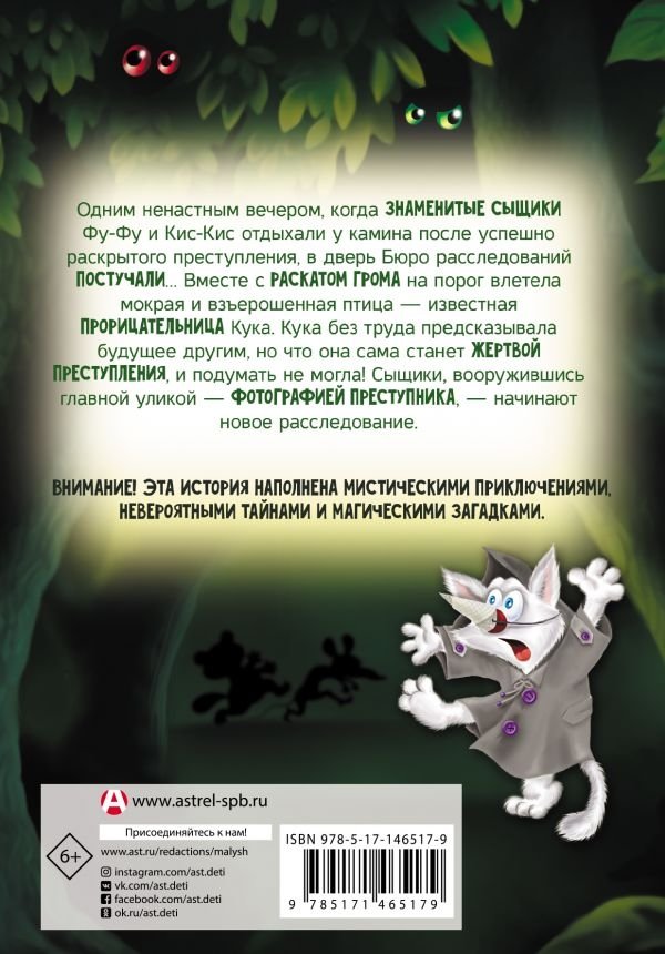 Одним ненастным вечером, когда знаменитые сыщики Фу-Фу и Кис-Кис отдыхали у камина после успешно раскрытого преступления, в дверь Бюро расследований постучали… Вместе с раскатом грома на порог влетела мокрая и взъерошенная птица — известная прорицательница Кука. Кука без труда предсказывала будущее другим, но что она сама станет жертвой преступления, и подумать не могла! Сыщики, вооружившись главной уликой — фотографией преступника, — начинают новое расследование.