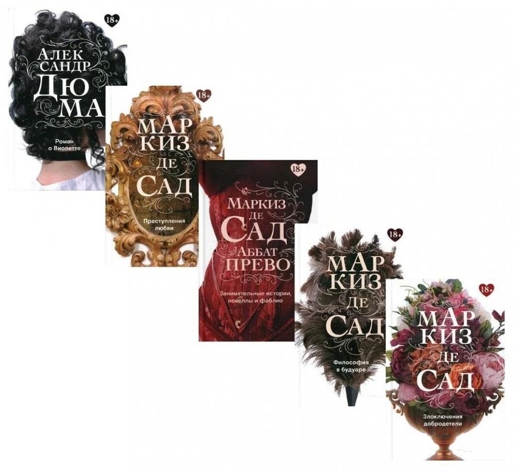 В комплекте представлены книги: «Злоключения добродетели» Маркиза де Сада, «Философия в будуаре, или Безнравственные наставники» Маркиза де Сада, «Преступления любви» Маркиза де Сада, «Занимательные истории, новеллы и фаблио» Маркиза де Сада и Аббата Прево, «Роман о Виолетте» Александра Дюма.