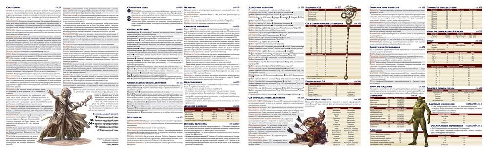 На ширме есть всё самое важное: состояния, описания действий, таблицы для выбора сложности, правила усиления и ослабления чудовищ и многое другое. Ширма напечатана на плотном ламинированном картоне и износоустойчива. Её можно использовать для регулярных игр дома или на конвентах.