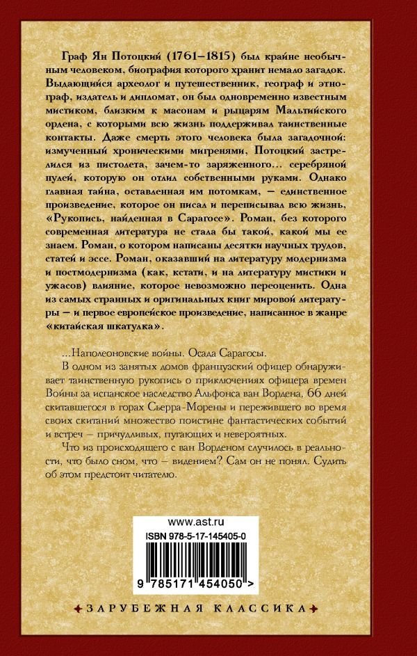 Граф Ян Потоцкий (1761—1815) был крайне необычным человеком, биография которого хранит немало загадок. Выдающийся археолог и путешественник, географ и этнограф, издатель и дипломат, он был одновременно известным мистиком, близким к масонам и рыцарям Мальтийского ордена, с которыми всю жизнь поддерживал таинственные контакты. Даже смерть этого человека была загадочной: измученный хроническими мигренями, Потоцкий застрелился из пистолета, зачем-то заряженного серебряной пулей, которую он отлил собственными руками. Однако главная тайна, оставленная им потомкам, - единственное произведение, которое он писал и переписывал всю жизнь, "Рукопись, найденная в Сарагосе".