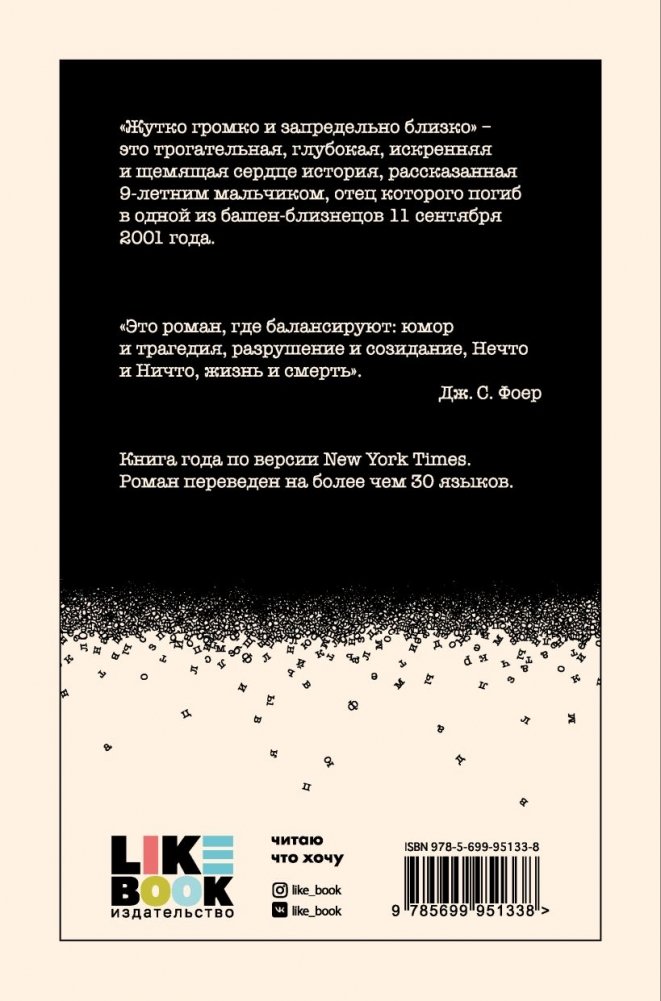 Перед вами легендарный роман Джонатана Сафрана Фоера «Жутко громко и запредельно близко». С момента его публикации в 2006 году прошло уже больше пятнадцати лет, но до сих пор его любят и читают по всему миру, книга издается тысячами копий и на десятках разных языков.