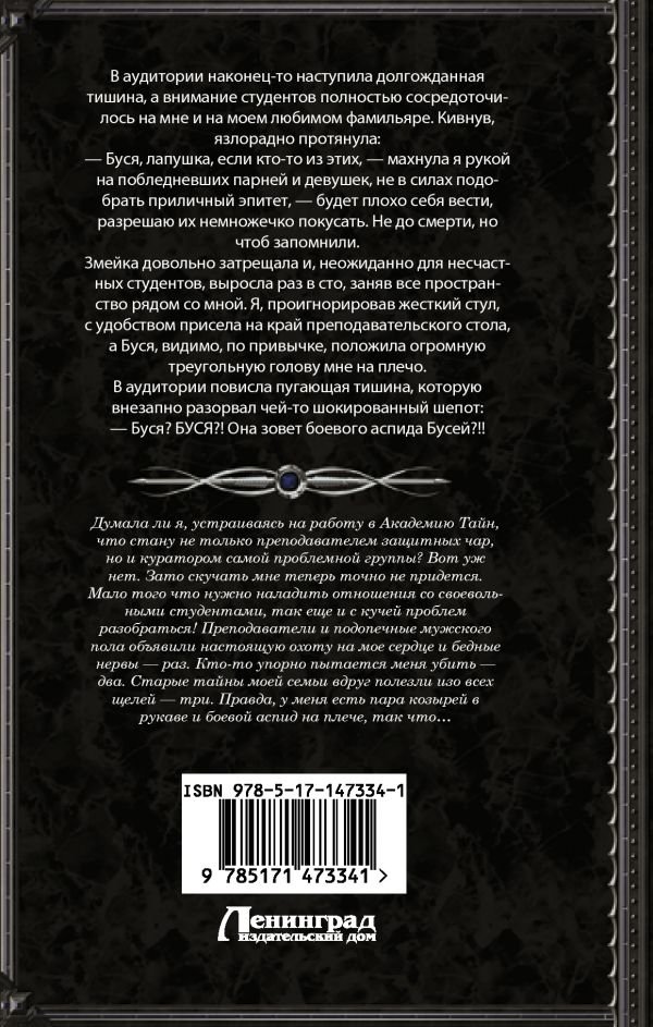 Думала ли я, устраиваясь на работу в Академию Тайн, что стану не только преподавателем защитных чар, но и куратором самой проблемной группы? Вот уж нет. Зато скучать мне теперь точно не придется. Мало того что нужно наладить отношения со своевольными студентами, так еще и с кучей проблем разобраться! Преподаватели и подопечные мужского пола объявили настоящую охоту на мое сердце и бедные нервы — раз. Кто-то упорно пытается меня убить — два. Старые тайны моей семьи вдруг полезли изо всех щелей — три. Правда, у меня есть пара козырей в рукаве и боевой аспид на плече, так что…