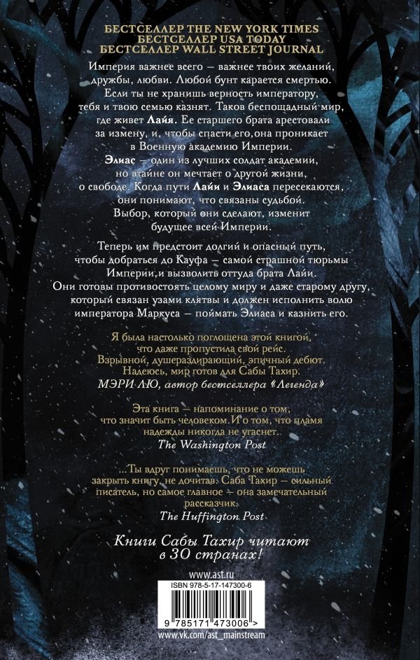 Империя важнее всего — важнее твоих желаний, дружбы, любви. Любой бунт карается смертью. Если ты не хранишь верность Императору, тебя и твою семью казнят. Таков беспощадный мир, где живет Лайя. Ее старшего брата арестовали за измену и, чтобы спасти его, она проникает в Военную академию Империи. Элиас — один из лучших солдат академии, но втайне он мечтает о другой жизни, о свободе. Когда пути Лайи и Элиаса пересекаются, они понимают, что связаны судьбой. Выбор, который они сделают, изменит будущее всей Империи. Теперь им предстоит долгий и опасный путь, чтобы добраться до Кауфа — самой страшной тюрьмы Империи, и вызволить оттуда брата Лайи. Они готовы противостоять целому миру и даже старому другу, который связан узами клятвы и должен исполнить волю императора Маркуса — поймать Элиаса и казнить его.