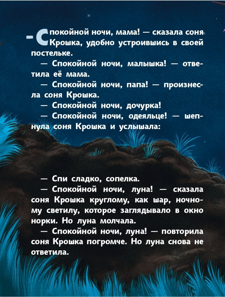 Однажды ночью соня Крошка, собираясь ложиться спать, пожелала спокойной ночи родителям, одеяльцу и далёкой белоликой красавице-луне. Но вот беда!.. «Ночное солнышко» не ответило ей! И вот на помощь Крошке приходят её друзья. Получится ли у них пожелать луне спокойной ночи и получить от неё ответ?