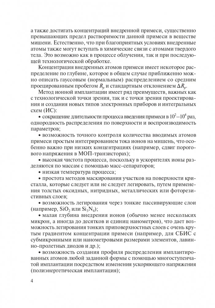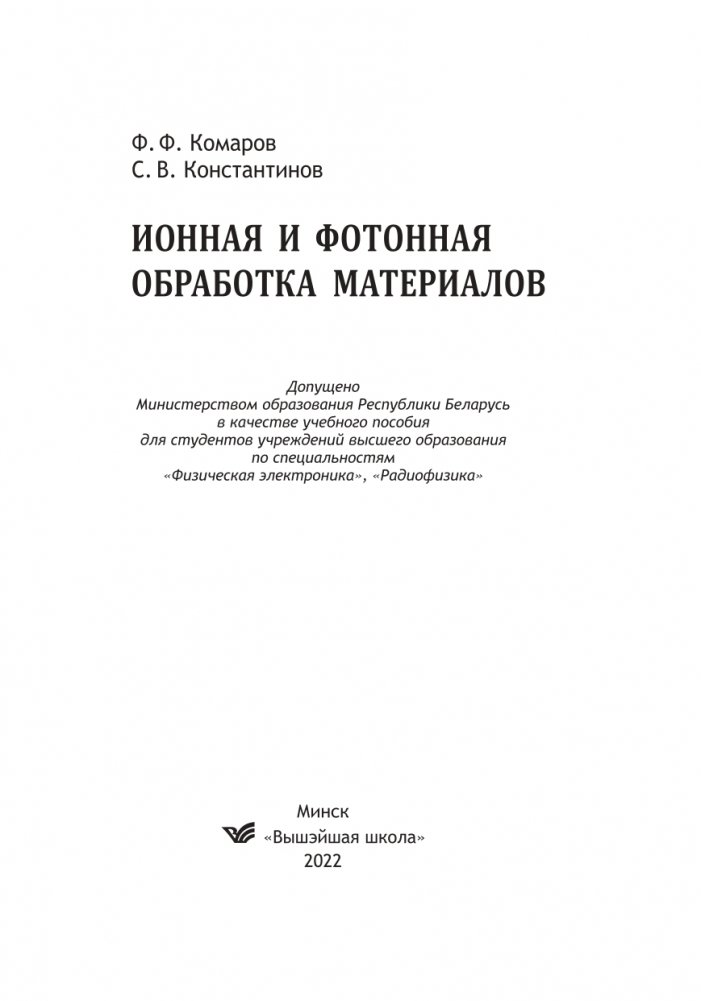 Изложены современные представления о физике взаимодействия ионных пучков с твердыми телами, рассмотрены вопросы образования и отжига дефектов кристаллической решетки, формирование заданных профилей распределения легирующих атомов. Приведены данные о современном оборудовании, используемом для ионной и фотонной обработки материалов, а также для изменения свойств ионно-имплантированных слоев. Рассмотрены приложения ионной и фотонной обработки в современных технологиях микроэлектроники и твердотельной электроники.