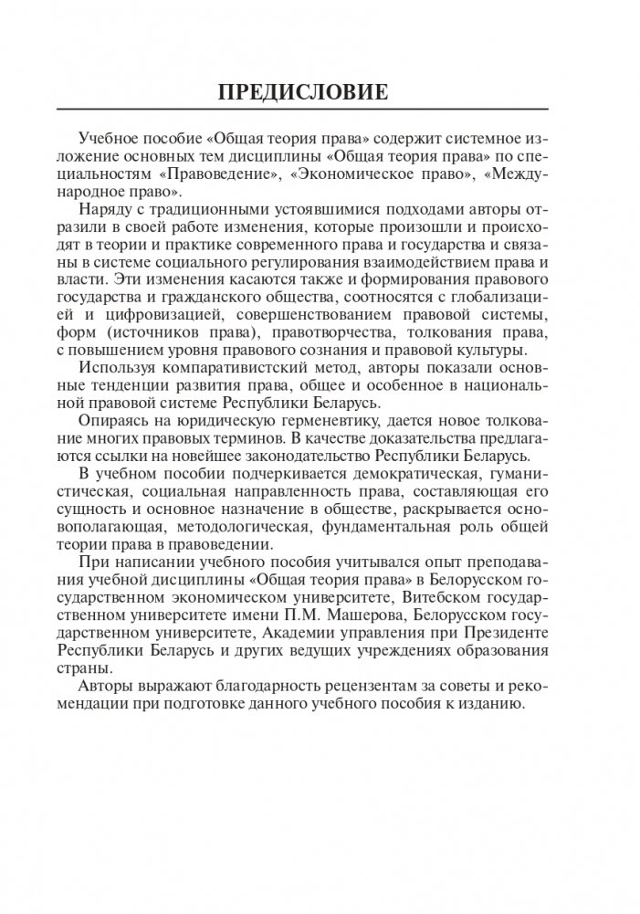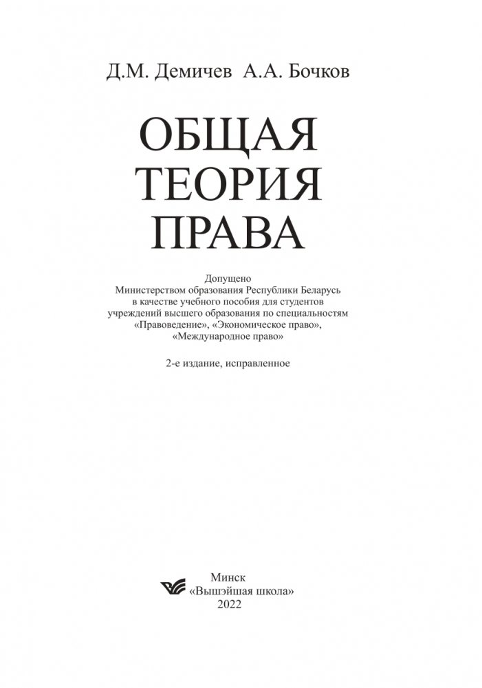 Учебное пособие разработано на основе обобщения опыта преподавания учебного курса «Общая теория права» в Белорусском государственном экономическом университете, Витебском государственном университете им. П.М. Машерова, Академии управления при Президенте Республики Беларусь и других учебных заведениях страны. Содержит основные темы учебной дисциплины «Общая теория права» в соответствии с типовой программой.