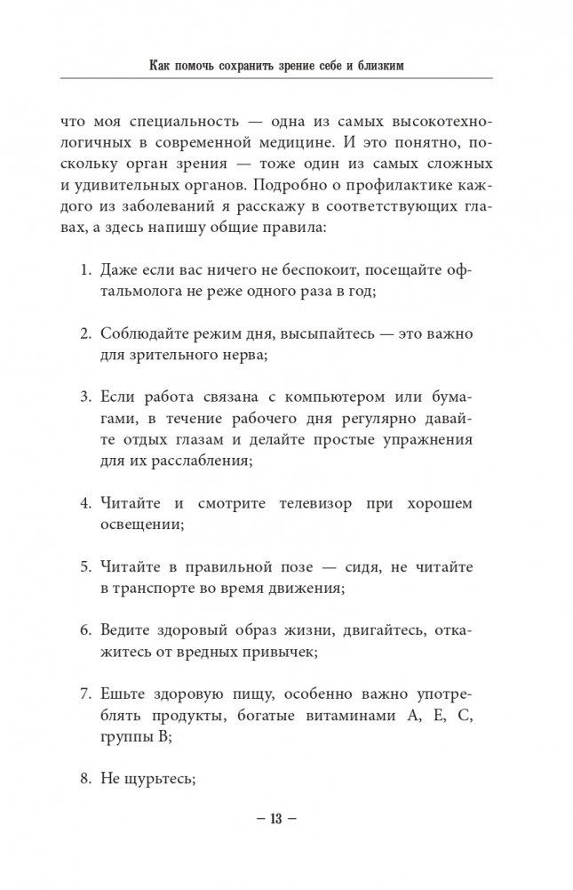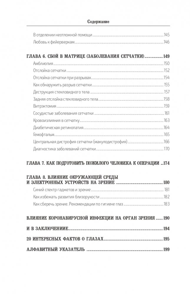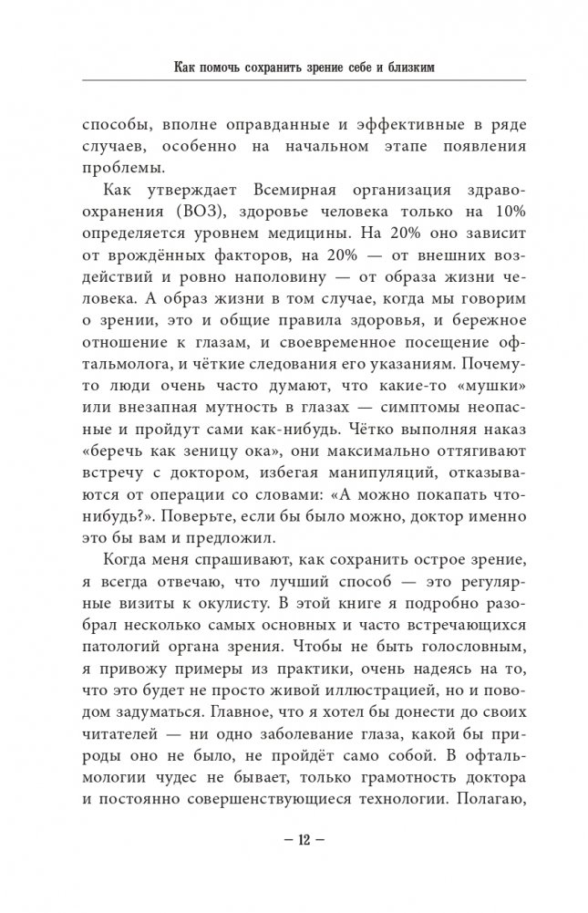 Катаракта, глаукома, амблиопия, возрастная дальнозоркость — есть сотни заболеваний глаз и почти всегда только одно настоящее лечение - хирургическое. Люди традиционно боятся любых оперативных вмешательств на лице. Но это не про глаза. Видеть хорошо сегодня можно в любом возрасте. Главное — своевременно обратиться ко врачу. В отличие от других областей медицины, в офтальмологии совершены невероятные прорывы (и о них мало кто знает). Более того, современные техники лечения доступны и распространены: практически каждую патологию можно вылечить, если своевременно обратиться ко врачу. В книге собраны различные советы по сохранению и восстановлению зрения и описаны современные методики помощи пациентам.