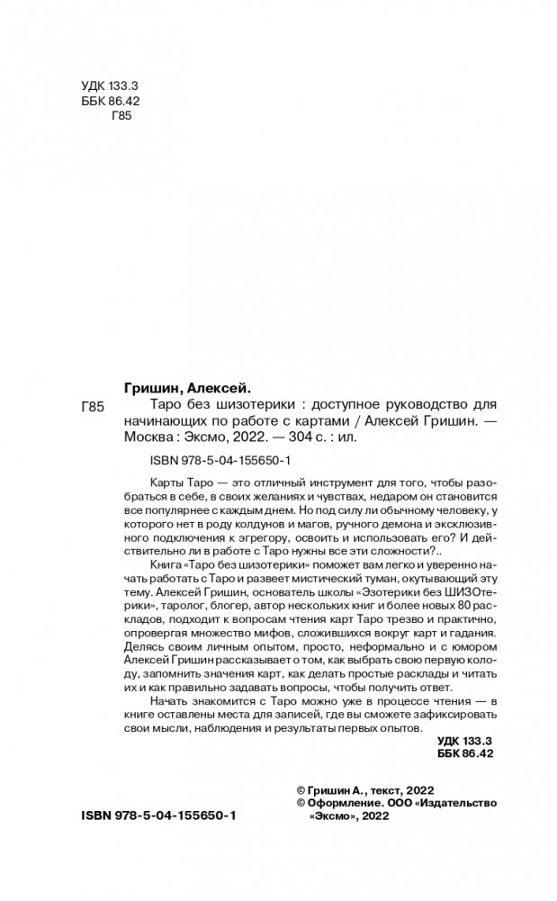 Книга "Таро без шизотерики" поможет вам легко и уверенно начать работать с Таро и развеет мистический туман, окутывающий эту тему. Алексей Гришин, основатель школы "Эзотерики без ШИЗОтерики", таролог, блогер, автор нескольких книг и более новых 80 раскладов, подходит к вопросам чтения карт Таро трезво и практично, опровергая множество мифов, сложившихся вокруг карт и гадания. Делясь своим личным опытом, просто, неформально и с юмором Алексей Гришин рассказывает о том, как выбрать свою первую колоду, запомнить значения карт, как делать простые расклады и читать их и как правильно задавать вопросы, чтобы получить ответ.