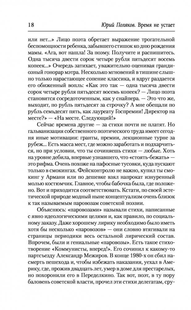 Книга "Время не устает" - последний, двенадцатый том собрания сочинений известного русского писателя Юрия Полякова, успешно работающего в разных жанрах. Он дебютировал как поэт в начале 1970-х, став одним из лидеров поколения поэтов, рожденных в пятидесятые годы. В этот том вошли стихи, сочиненные почти за полвека. Среди них - известные строфы, выходившие в периодике и включавшиеся автором в сборники, а также никогда не публиковавшиеся, хранившиеся в архиве и подготовленные специально для данного издания. Ранняя лирика Полякова принадлежит к лучшим образцам советской поэзии. Не оставят читателей равнодушными острые сатирические стихи на злобу дня, а также новые произведения, написанные зрелым мастером в последние годы. В книгу также включена известная работа Полякова о фронтовой поэзии "Между двумя морями", посвященная жизни и творчеству Георгия Суворова (1919-1944).