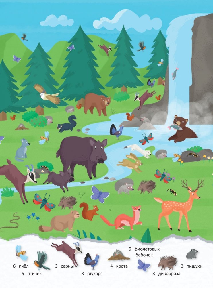 На каждой странице скрыто множество животных — придется напрячь зрение, чтобы отыскать их всех.