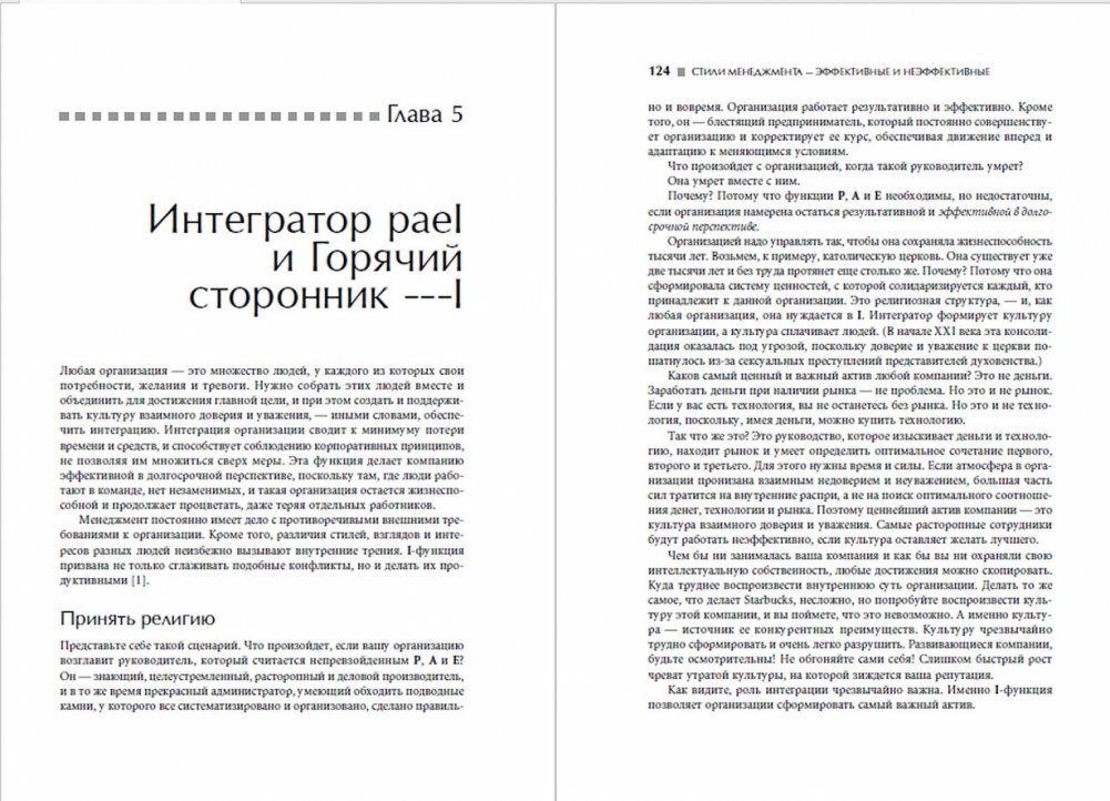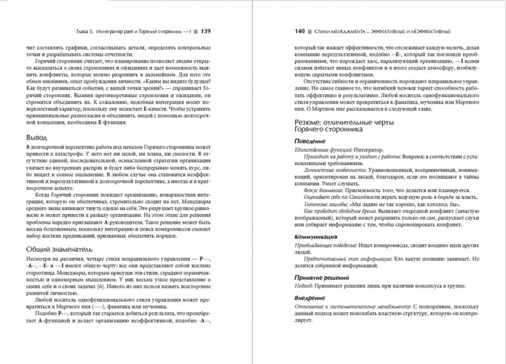 О том, что «идеального руководителя» не существует, потому что один человек просто не способен выполнять одинаково хорошо все четыре роли, необходимые для эффективного руководства организацией: быть и производителем результатов, и администратором, и предпринимателем, и интегратором. Место несуществующего «идеального руководителя» должна занять взаимодополняющая команда менеджеров, каждый член которой умеет выполнять одну из ролей в совершенстве, а остальными владеет на приемлемом уровне. При этом важно, чтобы в команде не было руководителей, которые концентрируются только на одной роли, полностью забывая про остальные. Такие перекосы делают менеджмент неэффективным и ставят под угрозу судьбу организации.