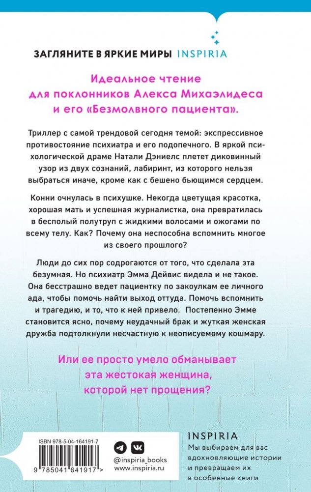Люди до сих пор содрогаются от того, что сделала эта безумная. Но психиатр Эмма Дейвис видела и не такое. Она бесстрашно ведет пациентку по закоулкам ее личного ада, чтобы помочь найти выход оттуда. Помочь вспомнить и трагедию, и то, что к ней привело. Постепенно Эмме становится ясно, почему неудачный брак и жуткая женская дружба подтолкнули несчастную к неописуемому кошмару.