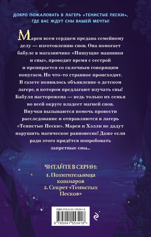 Марен всем сердцем предана семейному делу — изготовлению снов. Она помогает бабуле в магазинчике "Пишущие машинки и сны", проводит время с сестрой и припирается со склочным говорящим попугаем. Но что-то странное происходит. В газете появилось объявление о детском лагере, в котором предлагают изучать сны! Бабуля насторожена — ведь только их семья во всей округе владеет магией снов. Внучки вызываются помочь провести расследование и отправляются в лагерь "Тенистые пески". Марен и Хэлли не дадут нарушить магическое равновесие!