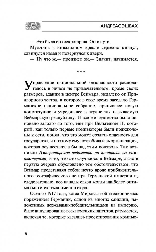 История XIX века изменилась, когда Чарльз Бэббидж создал аналитическую машину, запустив кибернетическую революцию, и к 1930‑м годам в Европе уже появились компьютеры, интернет, электронная почта и активное сетевое общение. Веймар, 1942 год. Здесь находится Управление национальной безопасности, которое со времен Вильгельма II контролирует активность в глобальной сети и имеет доступ ко всем данным, которые когда‑либо создавались гражданами Германского рейха, будь то банковские операции, встречи, электронные письма, дневниковые записи или выражения мнений на Немецком форуме. В нем работает программистка Хелена Боденкамп, дочь знаменитого на всю Германию хирурга и евгеника. Ее личная преданность режиму начинает рушиться под воздействием личных обстоятельств и одновременно она узнает, что начальник ее отдела, Ойген Леттке, сын героя Первой мировой войны, начинает использовать систему в собственных целях. Только ни он, ни она еще не подозревают, на что способны новые технологии в исторических условиях Германии 1930–1940‑х годов и насколько страшными могут быть технологии, кажущиеся такими привычными.