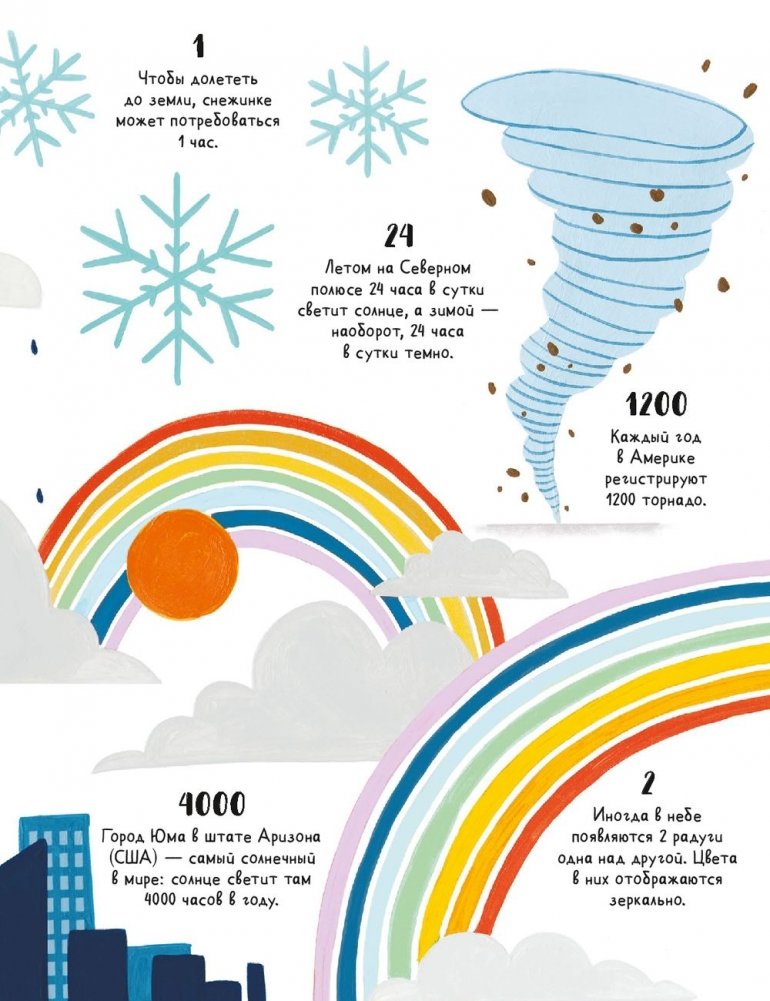 Знали ли вы, что у гепарда больше 2000 пятен? А у вас на лице 43 мускула? В книге собрано множество удивительных фактов (больше 350!) на самые разные темы: животные, растения, насекомые, еда, страны, архитектура и роботы, и даже рыцари и пираты. Каждый разворот посвящен одной теме.