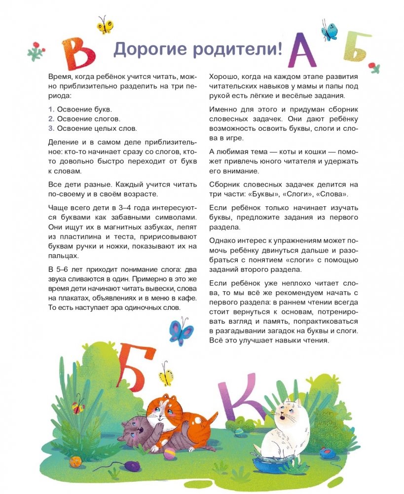 Главные герои книжки — профессор Буковкин и енот Платошка. Платошка изучает буквы, слоги и слова, а еще обожает кошек и котов — поэтому Буковкин придумал для него множество заданий, связанных с любимыми животными. Например, дорисовать букве О ушки, нос и усы так, чтобы получилась кошачья мордочка, или с помощью буквы Л построить шалашики и спасти котят от дождя. Игровая форма позволит ребенку быстрее освоить нужный навык и сделает учебу веселой и интересной.