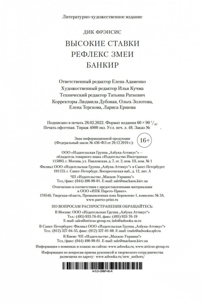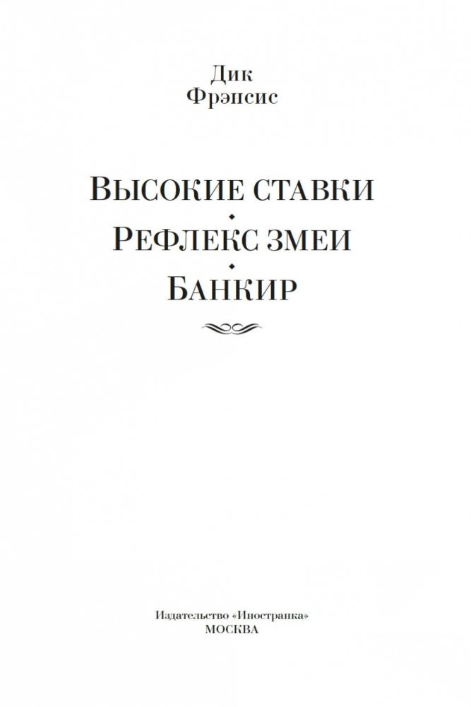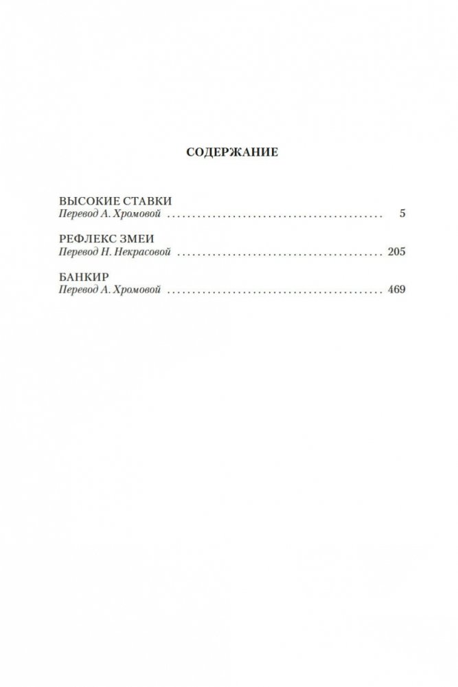 В сборник вошли романы «Высокие ставки» (1975), «Рефлекс змеи» (1980) и «Банкир» (1982).