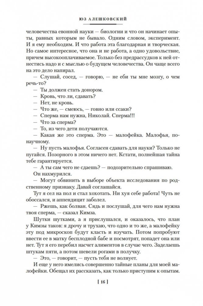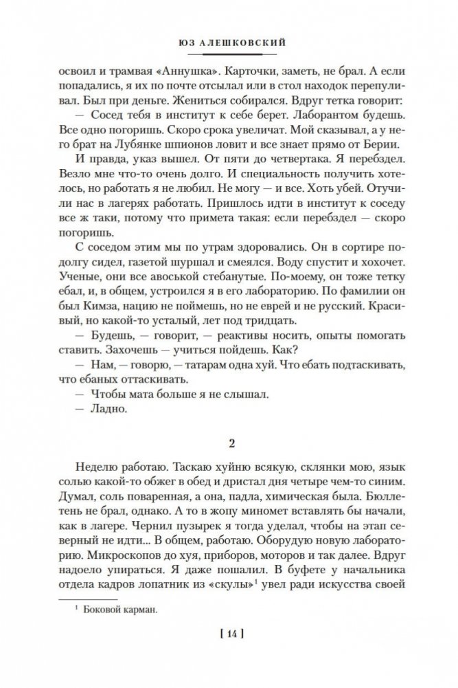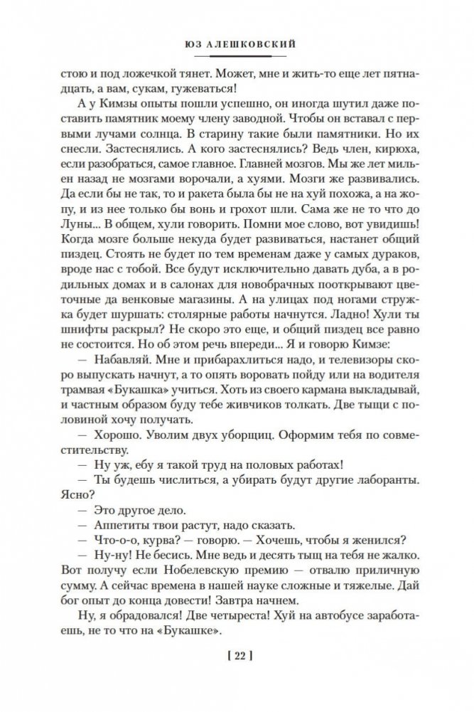 Юз Алешковский (1929–2022) — русский писатель и поэт, автор популярных «лагерных» песен, которые не исполнялись на советской эстраде, тем не менее обрели известность в народе, их горячо любили и пели, даже не зная имени автора. Перу Алешковского принадлежат также такие произведения, как «Николай Николаевич», «Кенгуру», «Маскировка» и др., которые тоже снискали народную любовь, хотя на родине писателя большая часть их была издана лишь годы спустя после создания. По словам Иосифа Бродского, в лице Алешковского мы имеем дело с уникальным типом писателя «как инструмента языка», в русской литературе таких примеров немного: Николай Гоголь, Андрей Платонов, Михаил Зощенко... «Сентиментальная насыщенность доведена в нем до пределов издевательских, вымысел — до фантасмагорических», писал Бродский, это «подлинный орфик: поэт, полностью подчинивший себя языку и получивший от его щедрот в награду дар откровения и гомерического хохота»