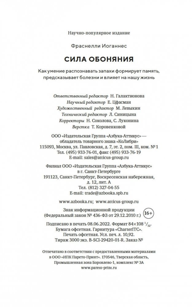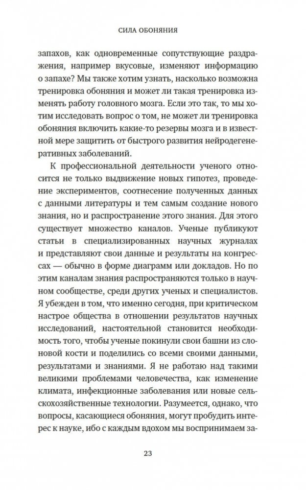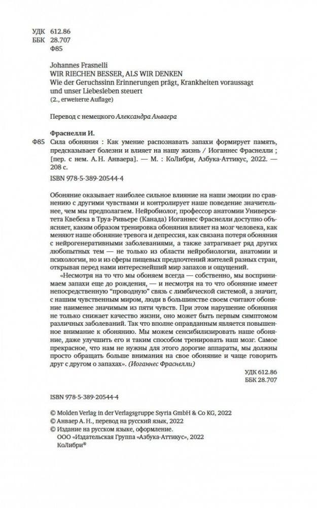 Обоняние оказывает наиболее сильное влияние на наши эмоции по сравнению с другими чувствами и контролирует наше поведение значительнее, чем мы предполагаем. Нейробиолог, профессор анатомии Университета Квебека в Труа-Ривьере (Канада) Иоганнес Фраснелли доступно объясняет, каким образом тренировка обоняния влияет на мозг человека, как меняют наше обоняние тревога и депрессия, как связана потеря обоняния с нейрогенеративными заболеваниями, а также затрагивает ряд других любопытных тем — не только из области нейробиологии, анатомии и психологии, но и из сферы пищевых предпочтений жителей разных стран, открывая перед нами интереснейший мир запахов и ощущений.
