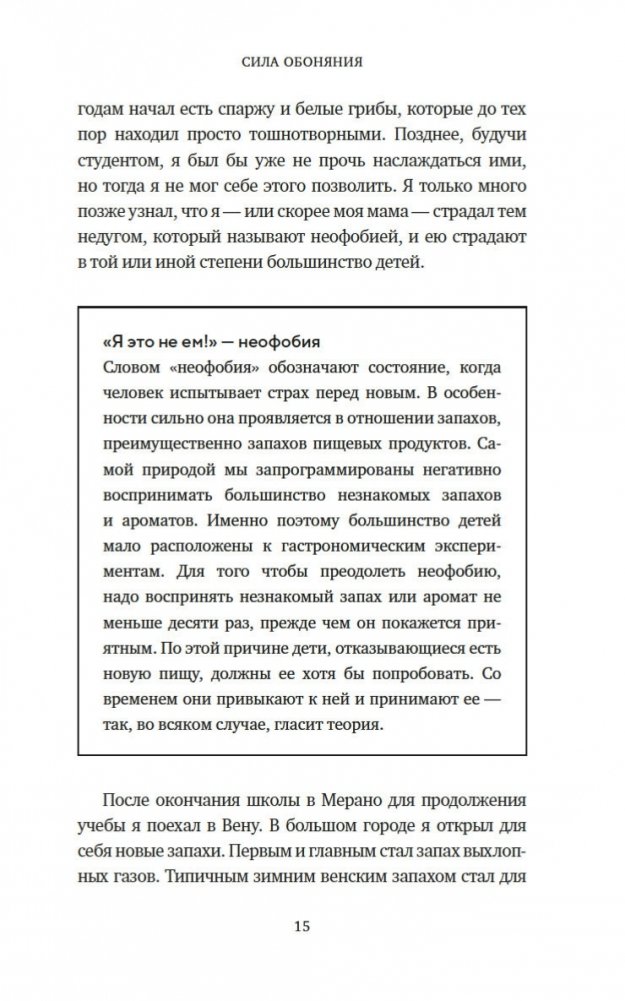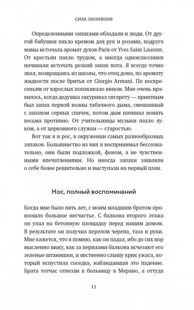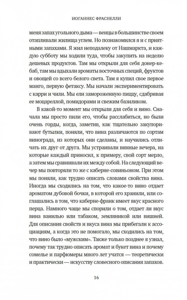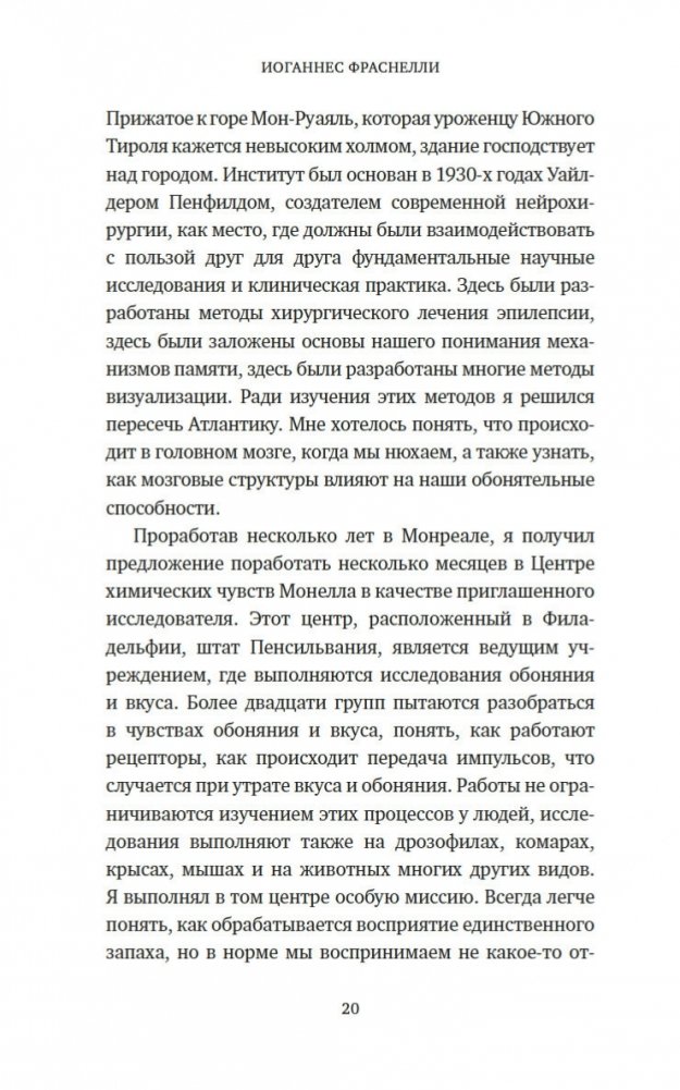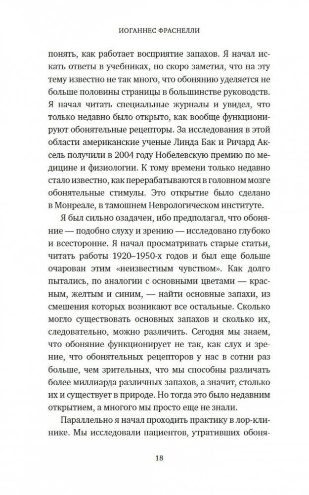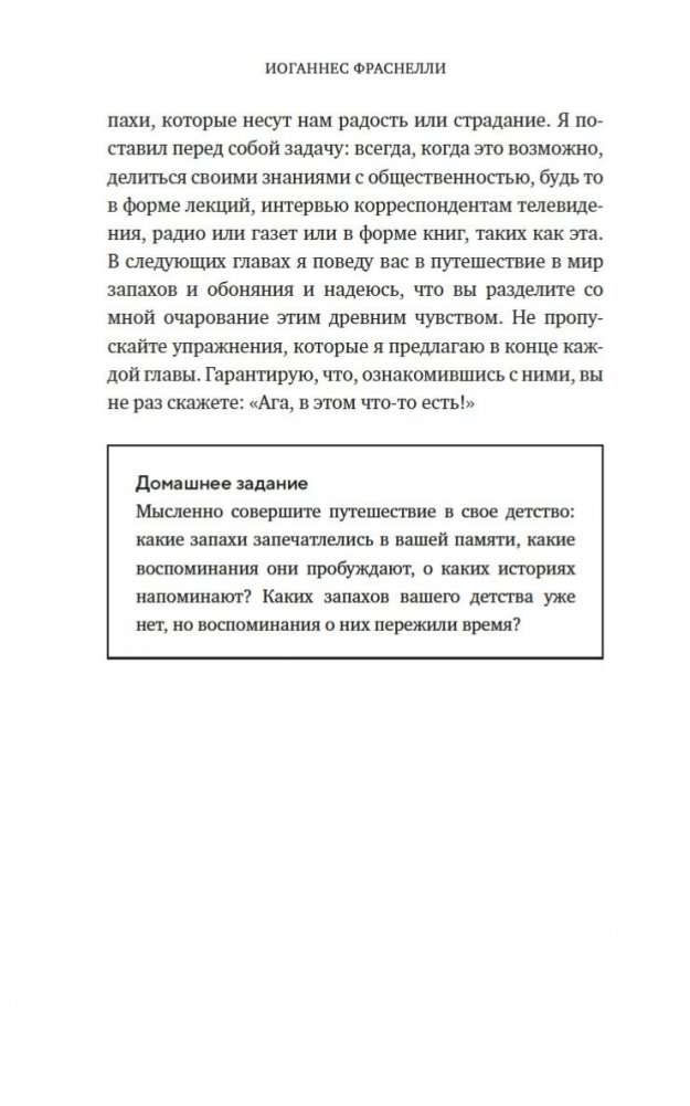 «Несмотря на то что мы обоняем всегда — собственно, мы воспринимаем запахи еще до рождения, — и несмотря на то что обоняние имеет непосредственную “проводную” связь с лимбической системой, а значит, с нашим чувственным миром, люди в большинстве своем считают обоняние наименее значимым из пяти чувств. При этом нарушение обоняния не только снижает качество жизни, оно может быть первым симптомом различных заболеваний. Так что вполне оправданным является повышенное внимание к обонянию. Мы можем сенсибилизировать наше обоняние, даже улучшить его и таким способом тренировать наш мозг. Самое прекрасное, что нам не нужны для этого дорогие аппараты, мы должны просто обращать больше внимания на свое обоняние и чаще говорить друг с другом о запахах». (Иоганнес Фраснелли)